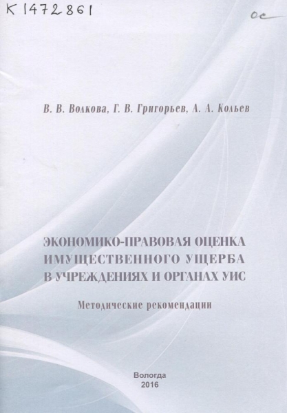 Волкова В. В. Экономико-правовая оценка имущественного ущерба в учреждениях и органах УИС : методические рекомендации / В. В. Волкова, Г. В. Григорьев, А. А. Кольев ; Федер. служба исполн. наказаний, Вологод. ин-т права и экономики. - Вологда : ВИПЭ ФСИН России, 2016. - 42 с. : ил., табл. - ISBN 978-5-94991-352-9.