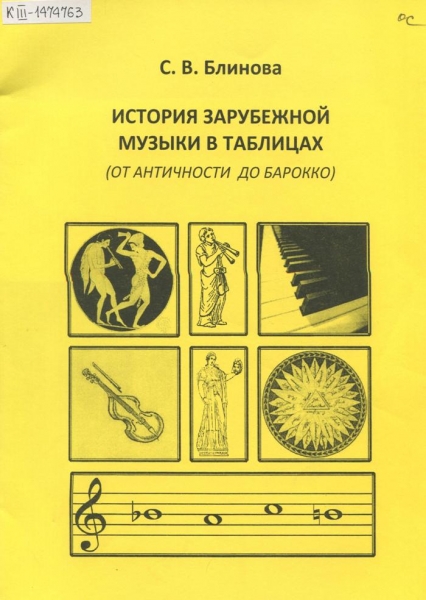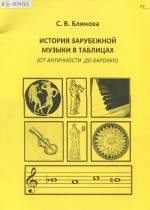 Блинова С. В. История зарубежной музыки в таблицах (от Античности до Барокко) : учебное пособие / С. В. Блинова ; М-во образования и науки Рос. Федерации, Вологод. гос. ун-т. - Вологда : ВоГУ, 2016. - 51, [1] с. : ил., ноты, табл. - ISBN 978-5-87851-648-8.