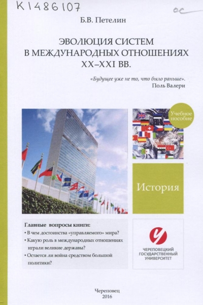 Петелин Б. В. Эволюция систем в международных отношениях в XX-XXI в.в. : учебное пособие / Б. В. Петелин. - Череповец : ЧГУ, 2016. - 126 с. - (История). - ISBN 978-5-85341-709-0.