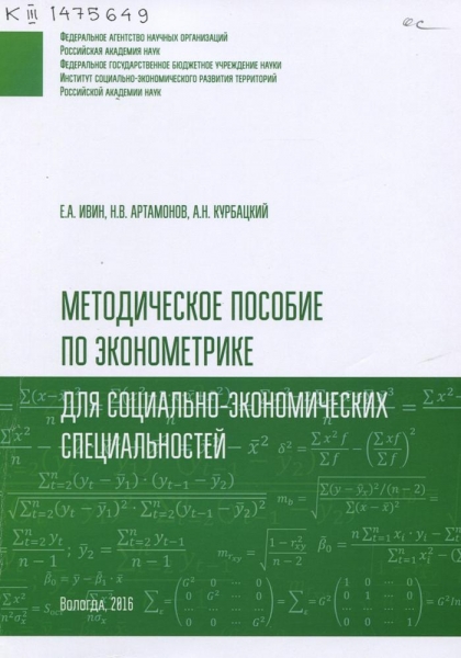 Ивин Е. А. Методическое пособие по эконометрике для социально-экономических специальностей / Е. А. Ивин, Н. В. Артамонов, А. Н. Курбацкий ; Федер. агентство науч. орг., Рос. акад. наук, Моск. гос. ун-т им. М. В. Ломоносова, Моск. шк. экономики, Федер. гос. бюджет. учреждение науки Ин-т соц.-экон. развития территорий Рос. акад. наук. - Вологда : ИСЭРТ РАН, 2016. - 183 с. : табл. - ISBN 978-5-93299-331-6.