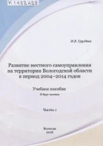 Груздева И. В. Развитие местного самоуправления на территории Вологодской области в период 2004-2014 годов : учебное пособие. В 2 ч. Ч. 1 / И. В. Груздева. - Вологда : ИСЭРТ РАН, 2016. - 291 с. : ил., табл. - ISBN 978-5-93299-349-1. - ISBN 978-5-9399-350-7.