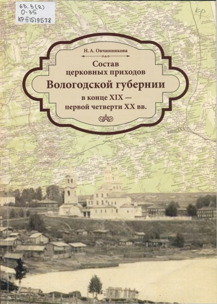 Овчинникова Наталья Андреевна. Состав церковных приходов Вологодской губерниии в конце XIX - первой четверти XX вв. : научно-справочное издание / Н. А. Овчинникова ; редактор: И. Н. Кузнецов ; Государственный архив Вологодской области. – Вологда : Арника, 2020. – 213 с. ; 29 см. – Библиогр. в примеч. в конце разд. – Указ.: с. 121-212. – ISBN 978-5-4429-0070-5.
