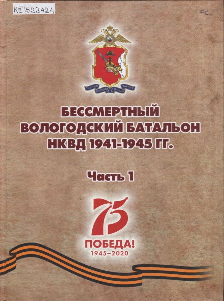 Бессмертный Вологодский батальон НКВД 1941-1945 гг. Часть 1 / Е. Р. Дружинин, Е. Б. Меркурьев, А. Л. Мялкин, А. В. Оботуров ; редактор-составитель: А. В. Оботуров ; УМВД России по Вологодской области, Вологодский областной архив новейшей политической истории. – Вологда : Киселев А. В., 2020. – 306 с. : ил., портр. ; 28 см. – Книга посвящена 75-летию Победы в Великой Отечественной войне 1941-1945 гг. – 300 экз. – ISBN 978-5-906945-40-2.
