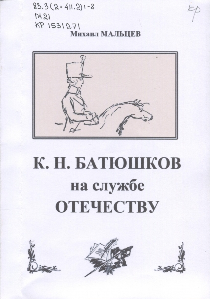 Мальцев Михаил Геннадьевич. К. Н. Батюшков на службе Отечеству / Михаил Мальцев ; Вологодская региональная общественная организация "Батюшковское общество". – Череповец, 2020. – 114, [2] с. : ил., портр., карты ; 20 см. – Библиогр.: с. 114-115. – 300 экз. – ISBN 978-5-6045875-0-8.