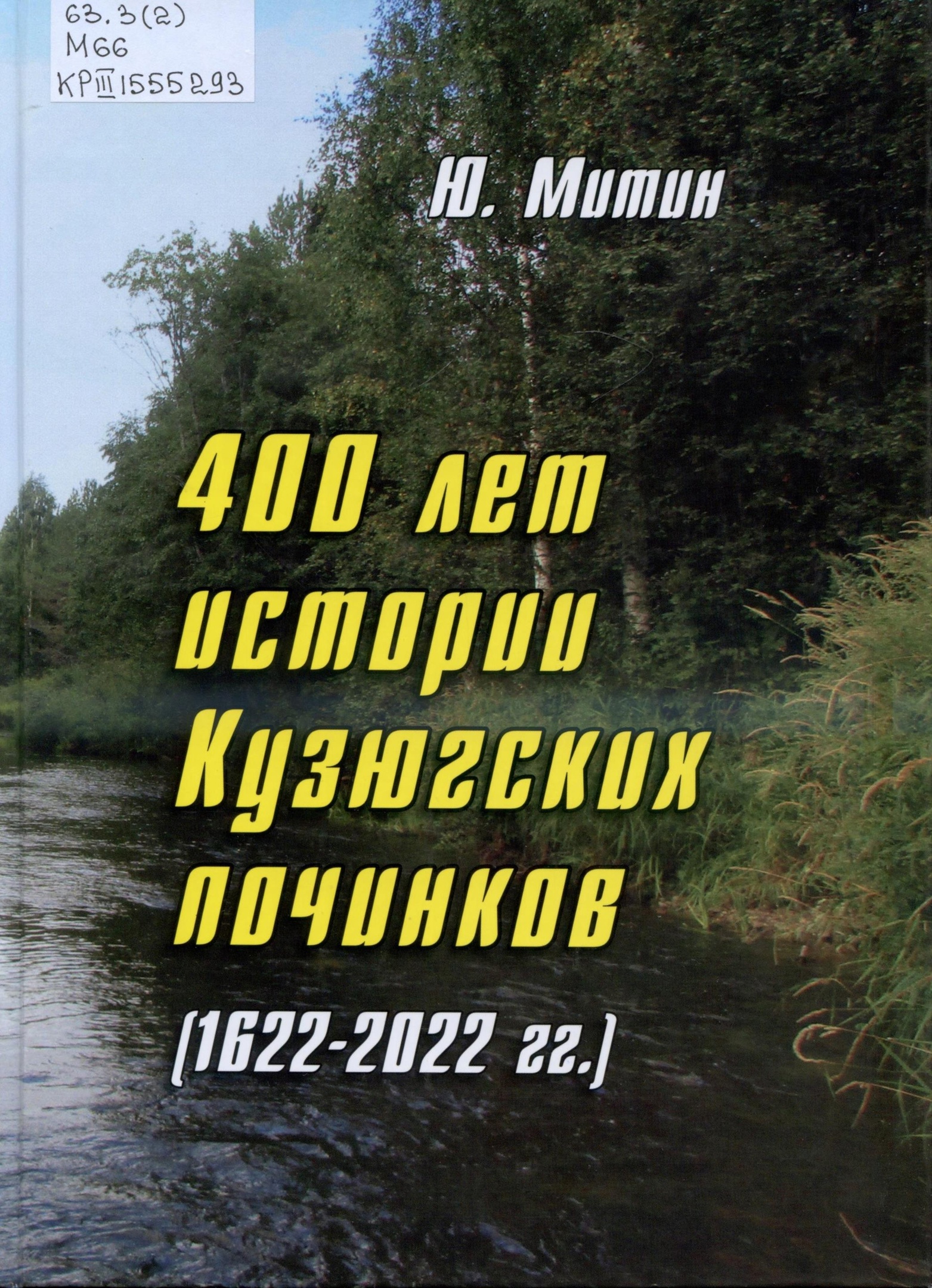 Митин Юрий Алексеевич. 400 лет истории Кузюгских починков (1622-2022 гг.) / Юрий Митин. – Вологда : Полиграф-Периодика, 2023. – 327 с., [8] л. цв. ил.: ил., портр., карты ; 25 см. – Библиогр.: с. 322-325. – 250 экз. – ISBN 978-5-91965-330-1.