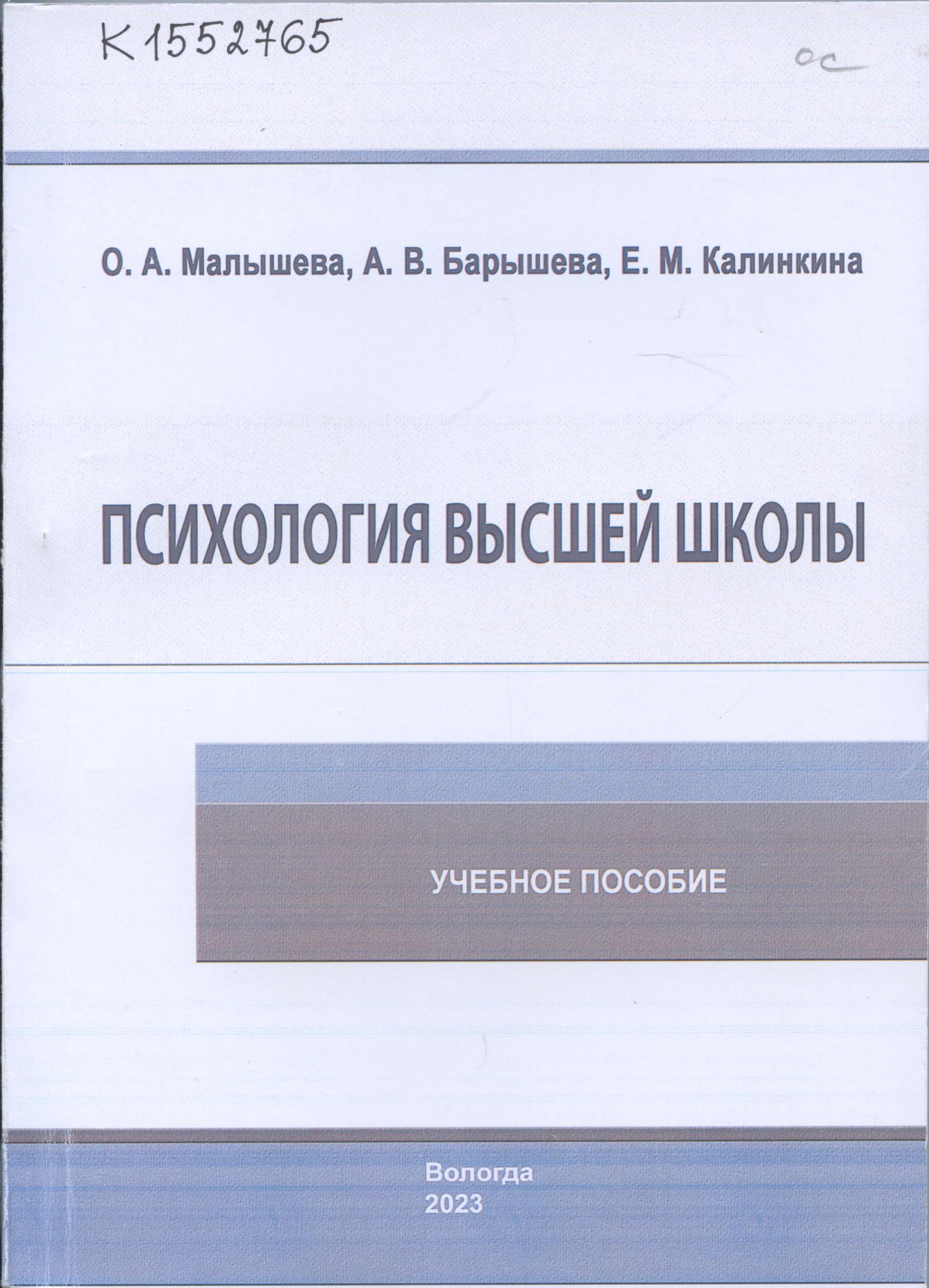 Малышева Ольга Александровна. Психология высшей школы : учебное пособие / О. А. Малышева, А. В. Барышева, Е. М. Калинкина ; Федеральная служба исполнения наказаний, Вологодский институт права и экономики. – Вологда : ВИПЭ ФСИН России, 2023. – 291 с.: ил., табл. ; 21 см. – Библиогр. в подстроч. примеч. и на с. 284–288. – 300 экз. – ISBN 978-5-94991-685-8.