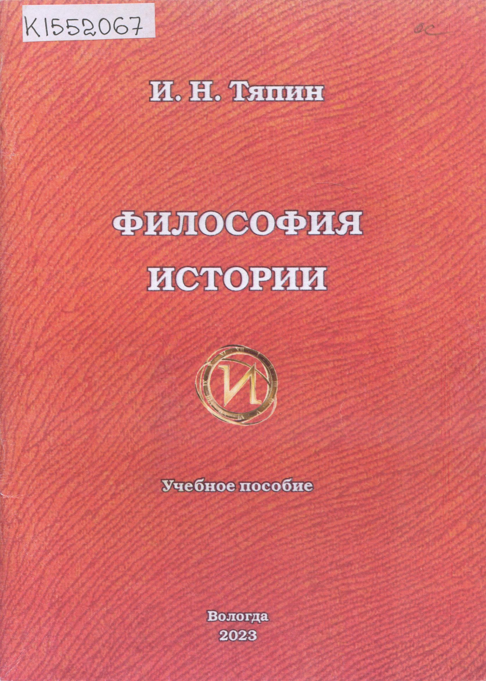 Тяпин Игорь Никифорович. Философия истории : учебное пособие / И. Н. Тяпин ; Министерство науки и высшего образования Российской Федерации, Вологодский государственный университет. – Вологда : ВоГУ, 2023. – 62 с. ; 20 см. – Библиогр.: с. 61–62 (25 назв.) – 300 экз. – ISBN 978-5-907606-41-8.