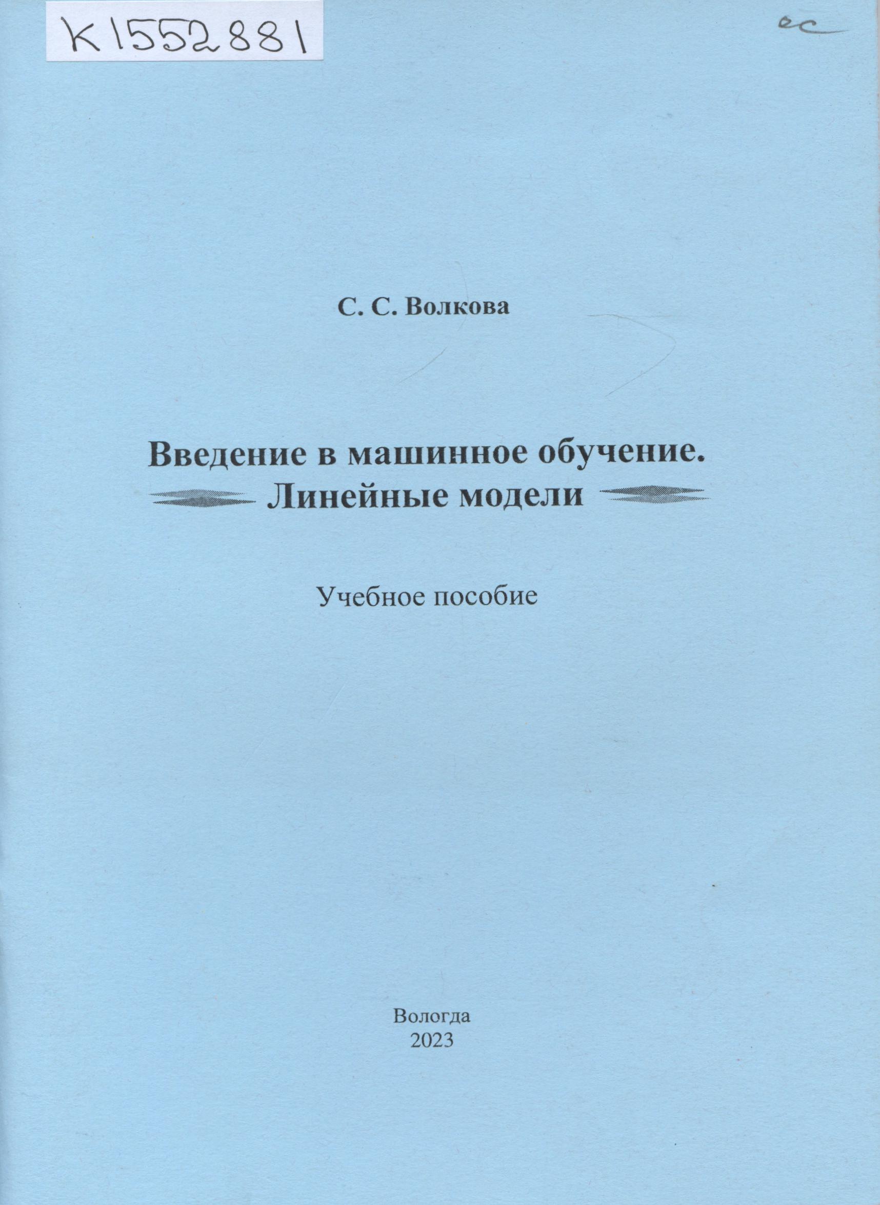 Волкова Светлана Сергеевна. Введение в машинное обучение. Линейные модели : учебное пособие / С. С. Волкова ; Министерство науки и высшего образования Российской Федерации, Вологодский государственный университет. – Вологда : ВоГУ, 2023. – 75 с. : ил., табл. ; 21 см. – Библиогр.: с. 75 (11 назв.). – 300 экз. – ISBN 978-5-907606-46-3.