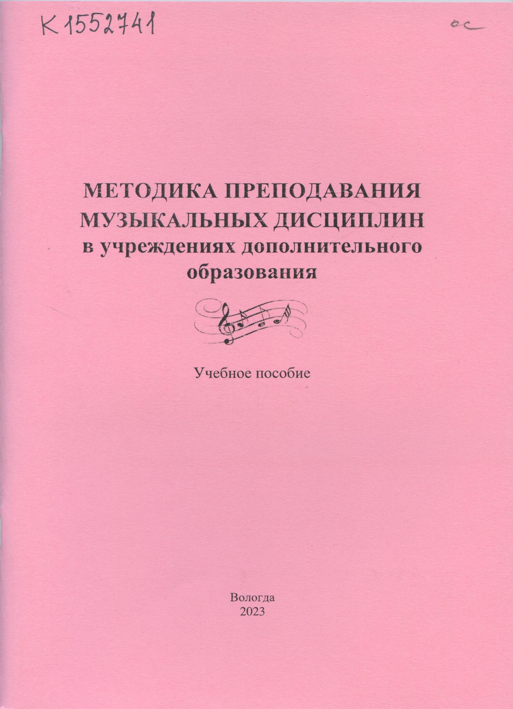 Сигова Вера Леонидовна. Методика преподавания музыкальных дисциплин в учреждениях дополнительного образования : учебное пособие : для студентов, обучающихся по направлению 44.03.05 Педагогическое образование, направленности (профилю) "Музыкальное и дополнительное образование" / В. Л. Сигова, И. В. Субботина ; Министерство науки и высшего образования РФ, Вологодский государственный университет. – Вологда : ВоГУ, 2023. – 94 с.: ил., табл. ; 20 см. – 300 экз. – ISBN 978-5-907606-48-6.