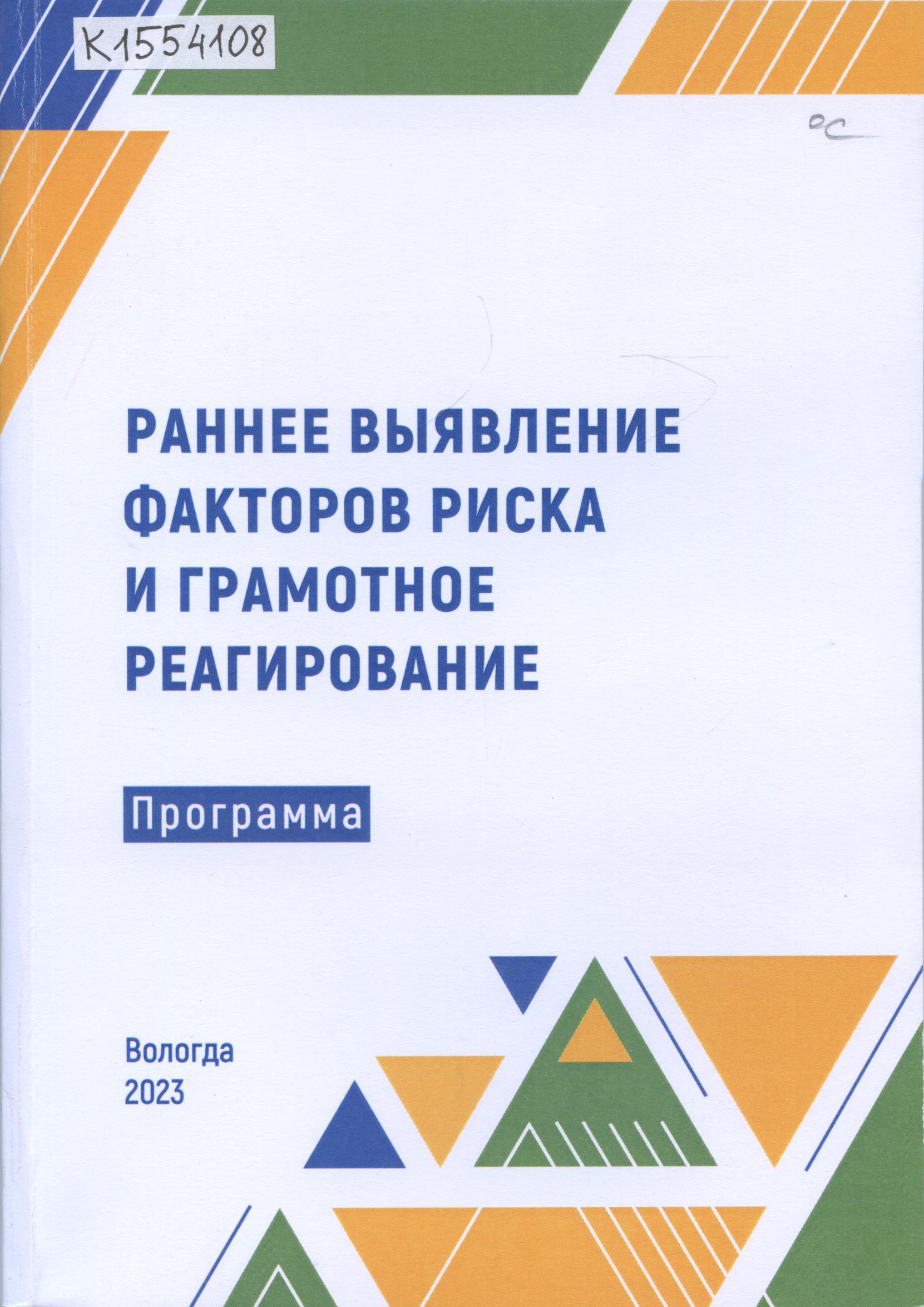 Раннее выявление факторов риска и грамотное реагирование : программа / Н. В. Афанасьева, Е. В. Шубина, Н. В. Малухина [и др.] ; под редакцией Н. В. Афанасьевой ; Департамент образования Вологодской области, Вологодский институт развития образования. – Вологда : ВИРО, 2023. – 118, [1] с. : табл. ; 20 см. – 100 экз. – ISBN 978-5-87590-547-6.