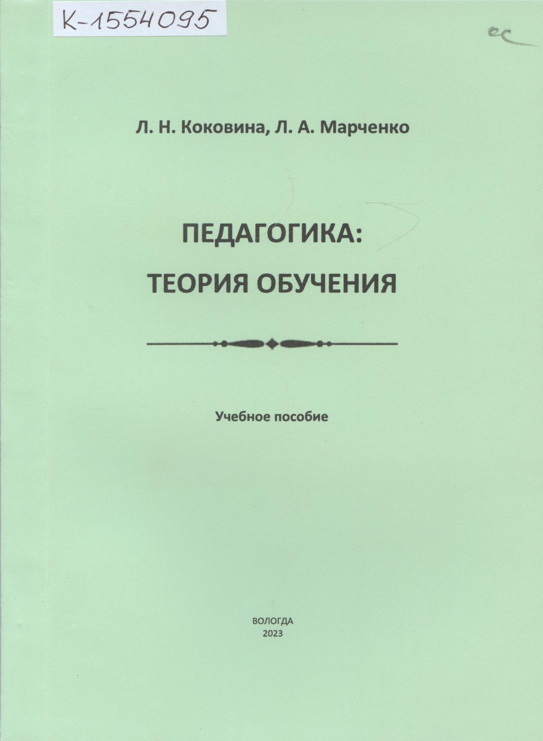 Коковина Любовь Николаевна. Педагогика: теория обучения : учебное пособие / Л. Н. Коковина, Л. А. Марченко ; Министерство науки и высшего образования Российской Федерации, Вологодский государственный университет. – Вологда : ВоГУ, 2023. – 135 с. : ил. ; 21 см. – Библиогр.: с. 133-135 (41 назв.). – 300 экз. – ISBN 978-5-907606-44-9.