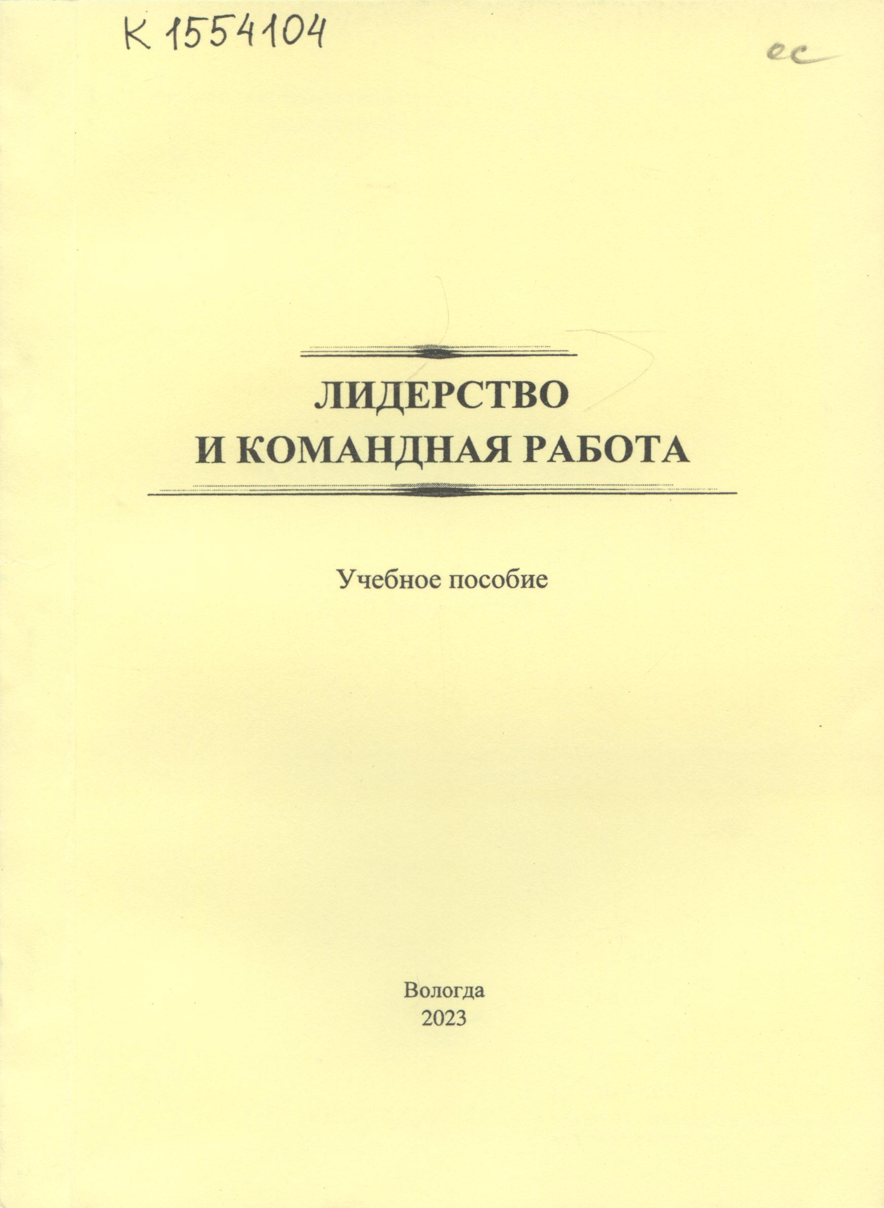 Фокина Ирина Владимировна. Лидерство и командная работа : учебное пособие / И. В. Фокина, М. О. Цатурян ; Министерство науки и высшего образования Российской Федерации, Вологодский государственный университет. – Вологда : ВоГУ, 2023. – 119, [1] с. : ил., табл. ; 20 см. – Библиогр.: с. 119-120 (27 назв.). – 300 экз. – ISBN 978-5-907606-49-4.