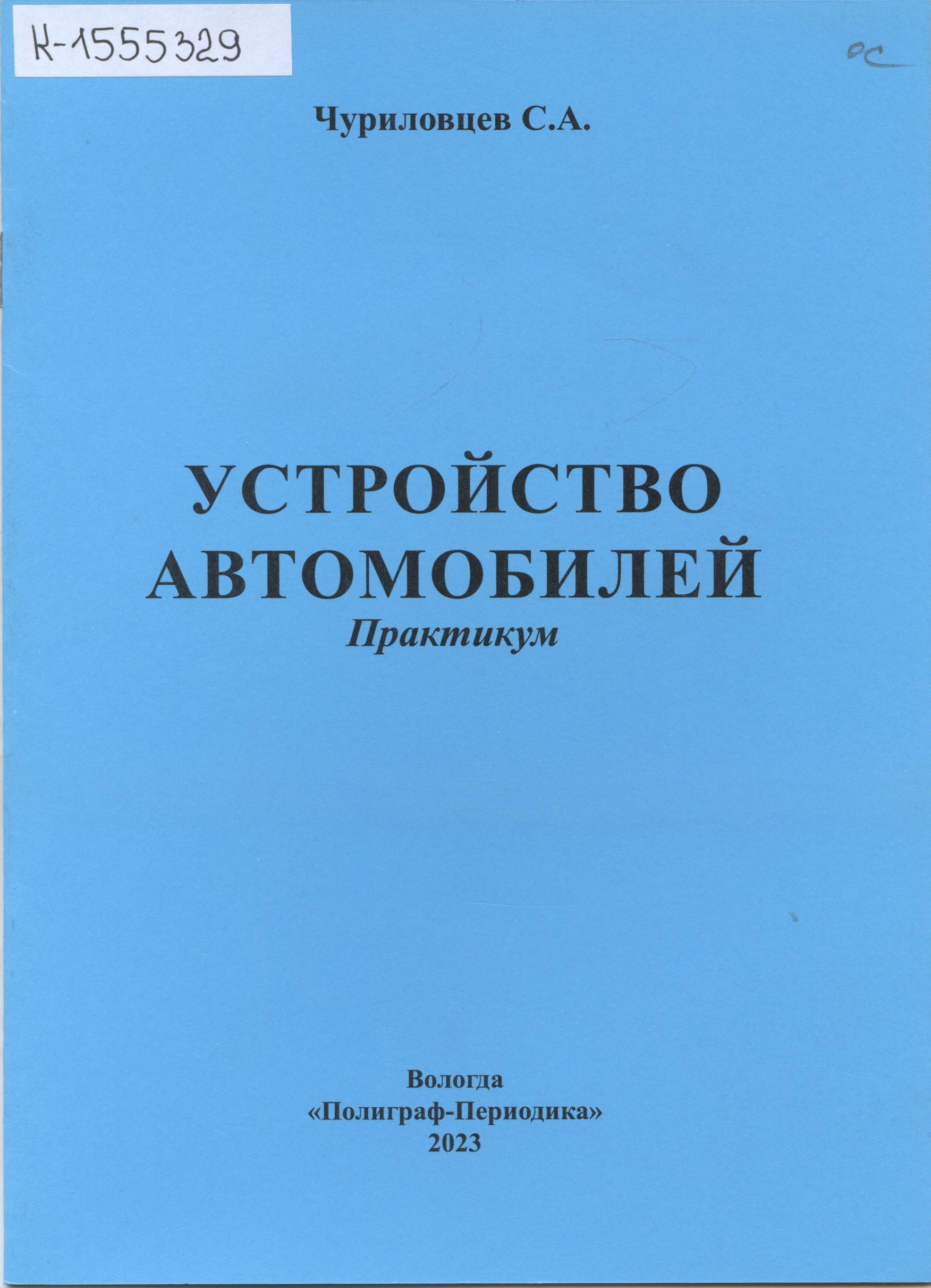 Чуриловцев Сергей Анатольевич. Устройство автомобилей : практикум / Чуриловцев С. А. – Вологда : Полиграф-Периодика, 2023. – 6 с. ; 21 см. – Библиогр.: с. 6 (6 назв.). – 22 экз. – ISBN 978-5-91965-333-2.