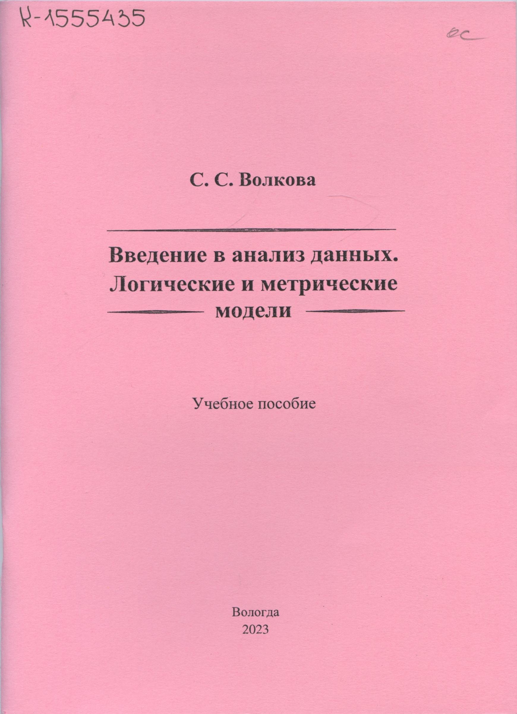 Волкова Светлана Сергеевна. Введение в анализ данных. Логические и метрические модели : учебное пособие / С. С. Волкова ; Министерство науки и высшего образования Российской Федерации, Вологодский государственный университет. – Вологда : ВоГУ, 2023. – 79 с.: ил. ; 20 см. – Библиогр.: с. 78-79 – 300 экз. – ISBN 978-5-907606-61-6.