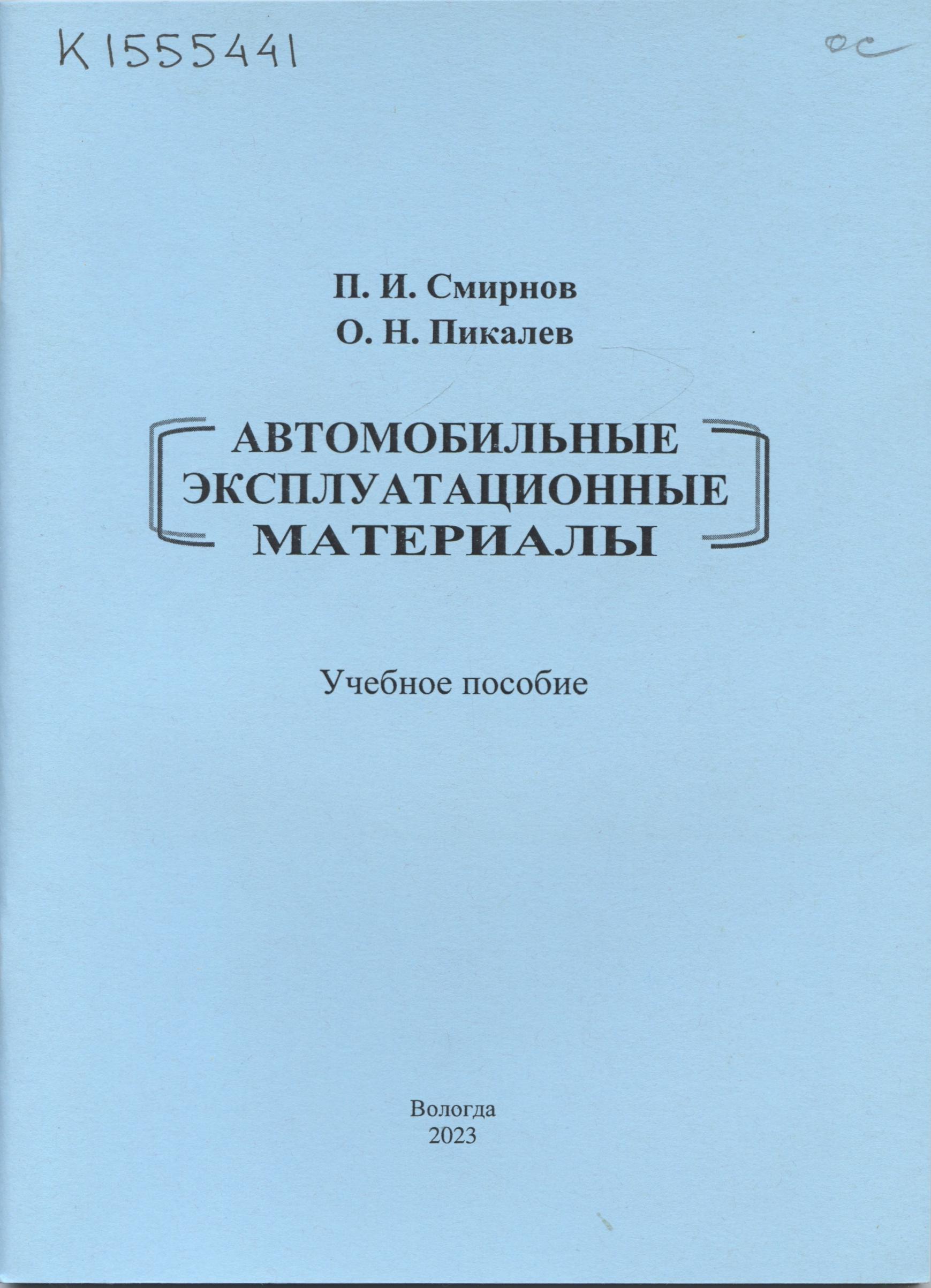 Смирнов Петр Ильич. Автомобильные эксплуатационные материалы : учебное пособие / П. И. Смирнов, О. Н. Пикалев ; Министерство науки и высшего образования Российской Федерации, Вологодский государственный университет. – Вологда : ВоГУ, 2023. – 84 с.: ил. ; 20 см. – Библиогр.: с. 82-84. – 300 экз. – ISBN 978-5-907606-53-1.