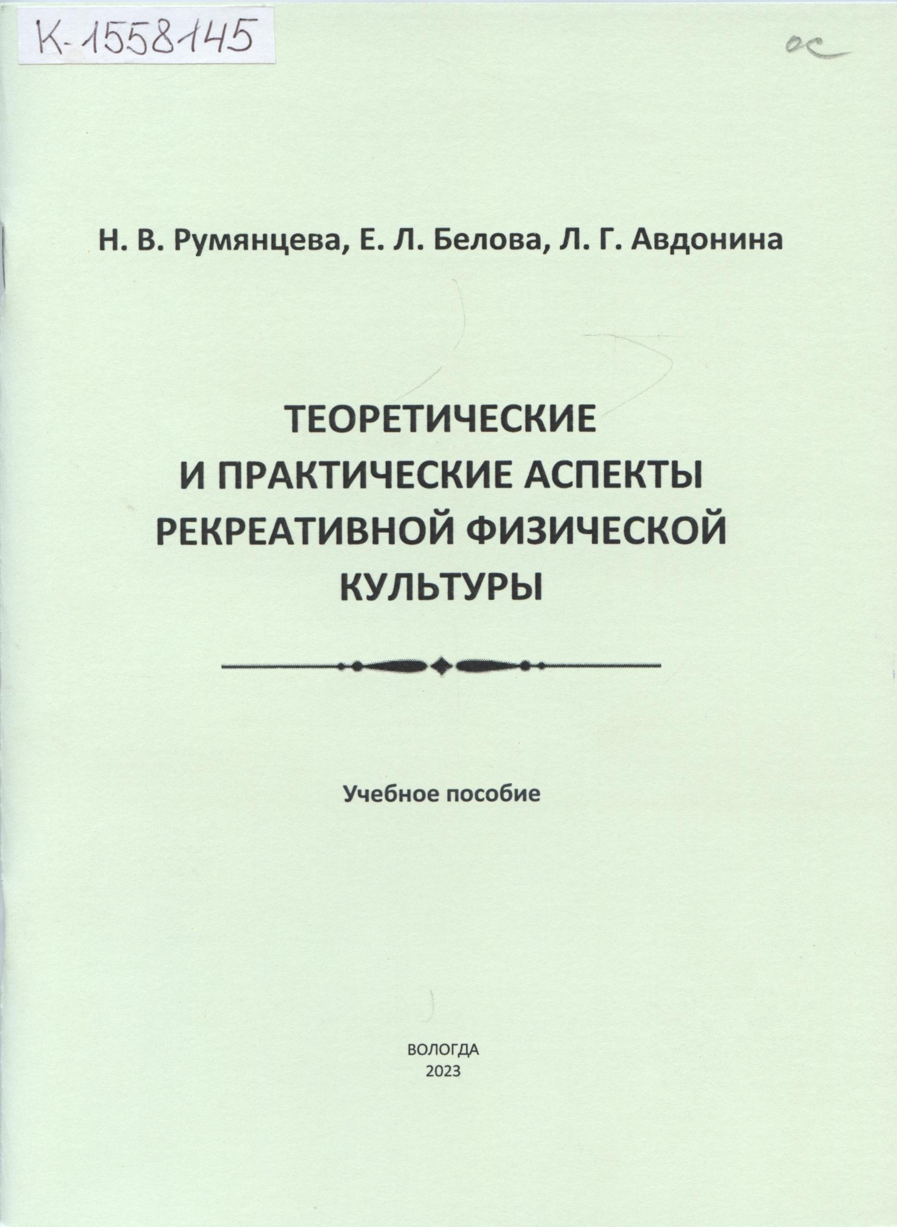 Румянцева Наталья Валерьевна. Теоретические и практические аспекты рекреативной физической культуры : учебное пособие / Н. В. Румянцева, Е. Л. Белова, Л. Г. Авдонина ; Министерство науки и высшего образования Российской Федерации, Вологодский государственный университет. – Вологда : ВоГУ, 2023. – 67 с. : табл. ; 21 см. – Библиография: с. 61-66 (51 назв.) – 300 экз. – ISBN 978-5-907606-68-5.