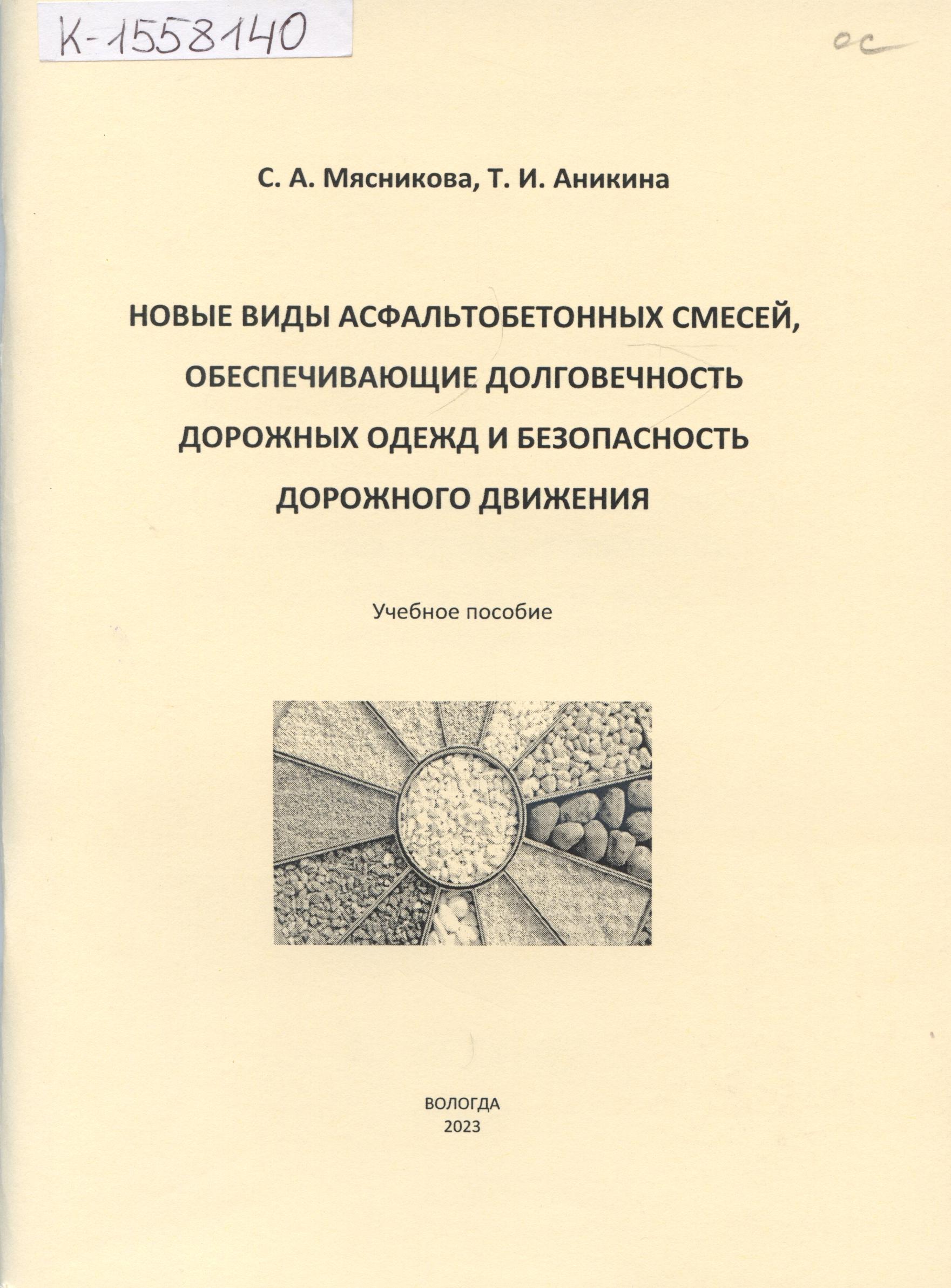 Мясникова Светлана Александровна. Новые виды асфальтобетонных смесей, обеспечивающие долговечность дорожных одежд и безопасность дорожного движения : учебное пособие / С. А. Мясникова, Т. И. Аникина ; Министерство науки и высшего образования Российской Федерации, Вологодский государственный университет. – Вологда : ВоГУ, 2023. – 83 с.: ил. ; 21 см. – Библиография: с. 80-83 (36 назв.). – 300 экз. – ISBN 978-5-907606-76-0.