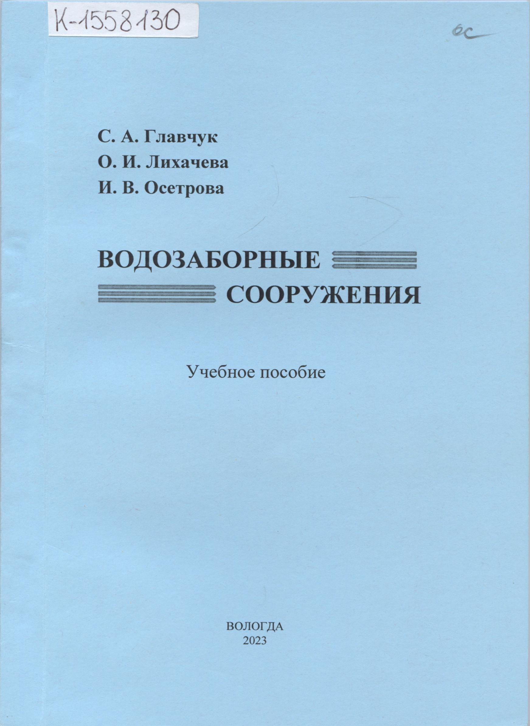 Главчук Светлана Алексеевна. Водозаборные сооружение : учебное пособие / С. А. Главчук, О. И. Лихачева, И. В. Осетрова ; Министерство науки и высшего образования Российской Федерации, Вологодский государственный университет. – Вологда : ВоГУ, 2023. – 105 с.: ил. ; 21 см. – Библиография: с. 97-98 (23 назв.). – 300 экз. – ISBN 978-5-907606-74-6.
