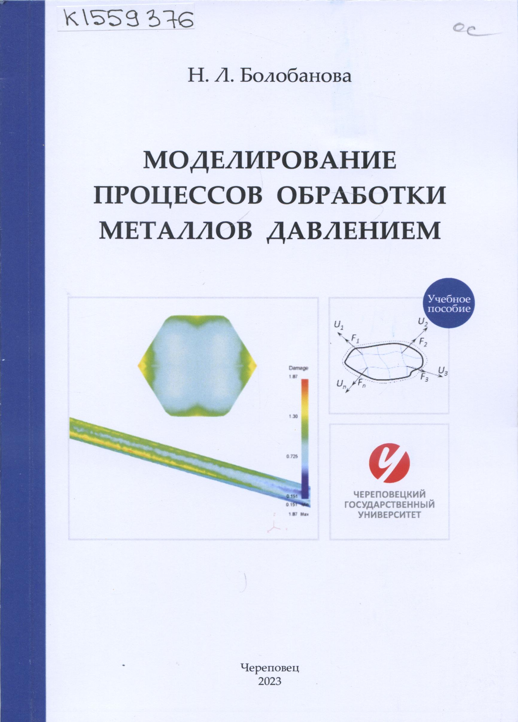 Болобанова Наталия Леонидовна. Моделирование процессов обработки металлов давлением : учебное пособие / Н. Л. Болобанова ; Череповецкий государственный университет. – Череповец : ЧГУ, 2023. – 103 с.: ил., граф., табл. ; 20 см. – Библиогр.: с. 102-103 (20 назв.). – 300 экз. – ISBN 978-5-85341-950-6.
