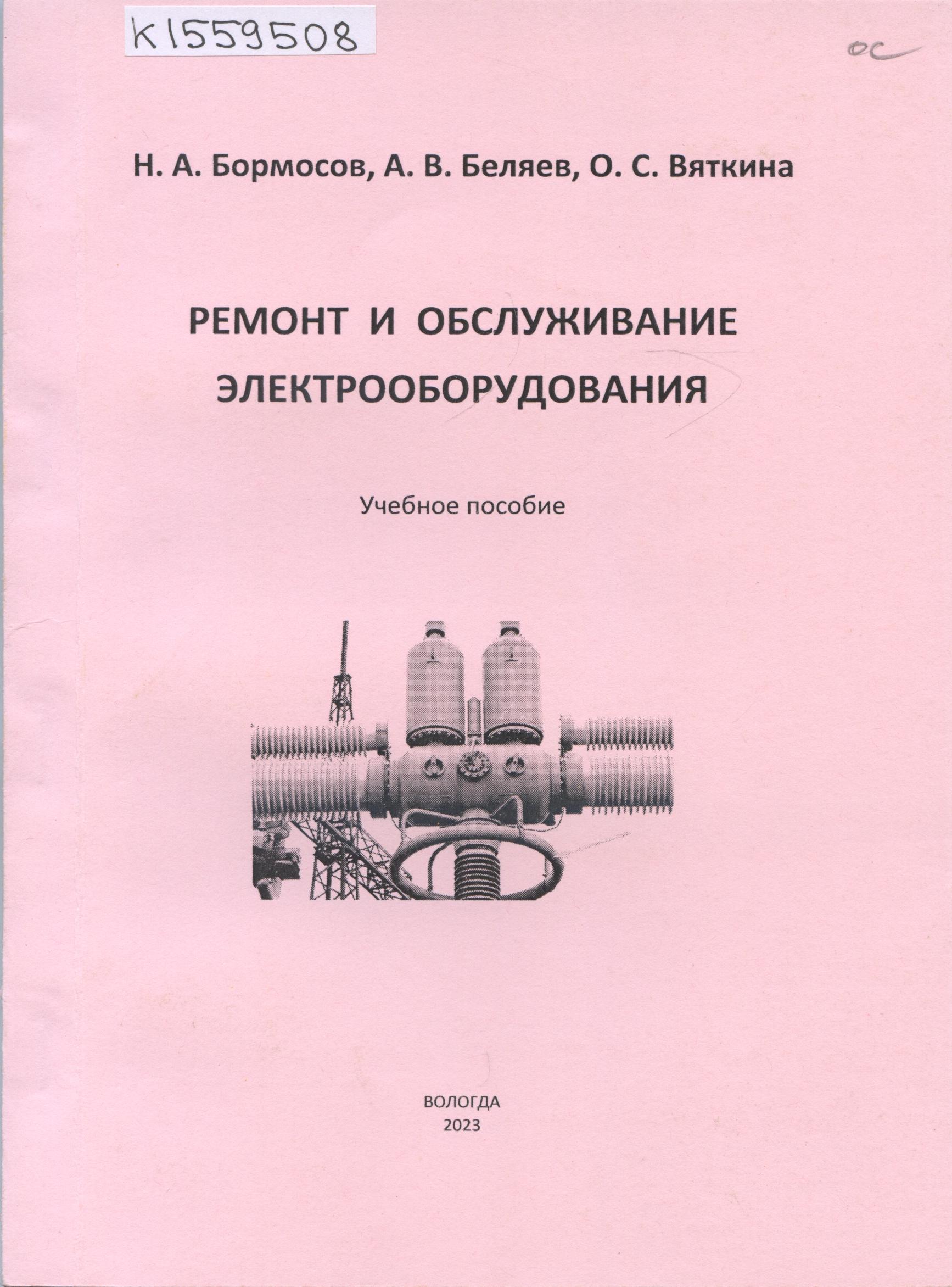 Бормосов Николай Александрович. Ремонт и обслуживание электрооборудования : учебное пособие / Н. А. Бормосов, А. В. Беляев, О. С. Вяткина ; Министерство науки и высшего образования Российской Федерации, Вологодский государственный университет. – Вологда : ВоГУ, 2023. – 107 с. : ил., граф., табл. ; 20 см. – Библиогр.: с. 80-81 (18 назв.) – 300 экз. – ISBN 978-5-907606-71-5.