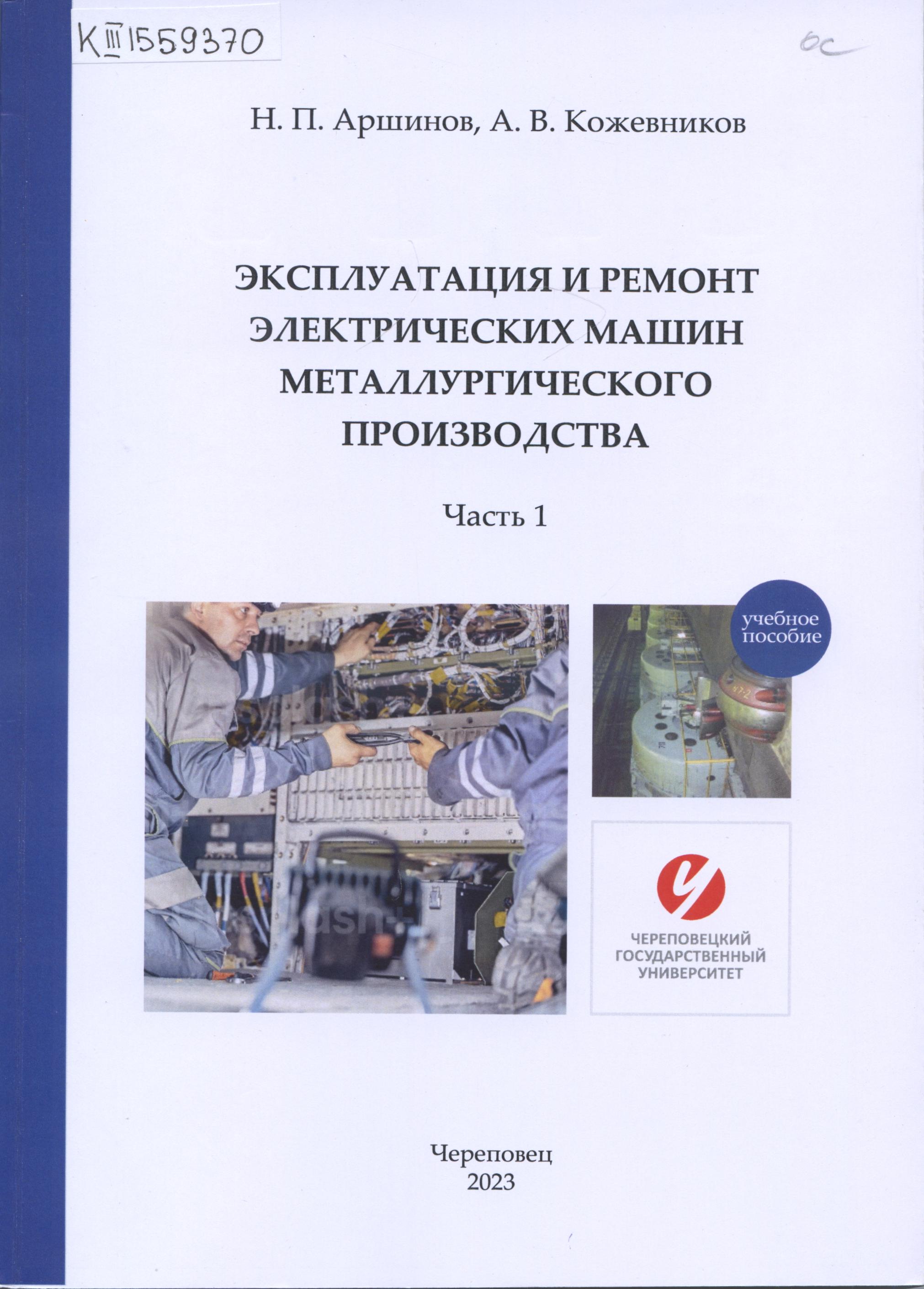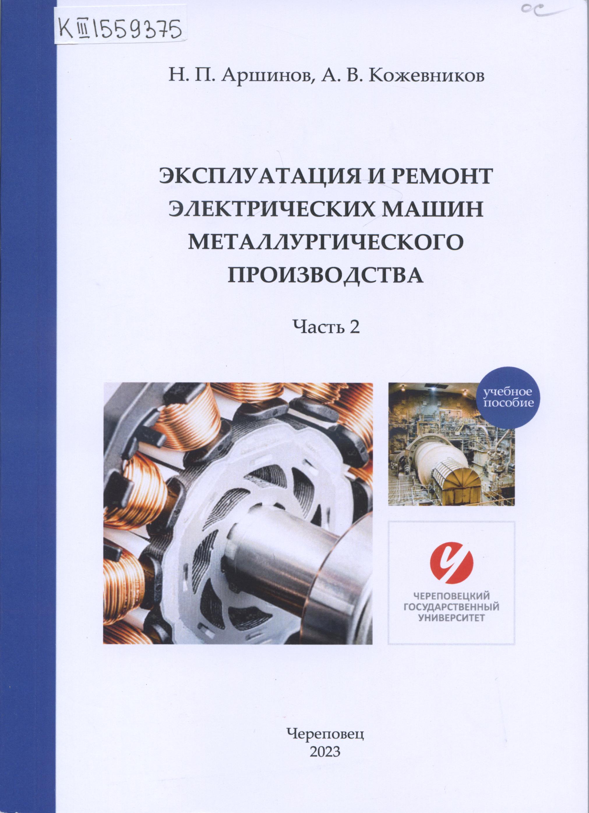 Аршинов Николай Петрович. Эксплуатация и ремонт электрических машин металлургического производства: учебно-справочное пособие. В двух частях. Часть 2 / Н. П. Аршинов, А. В. Кожевников ; Череповецкий государственный университет. – Череповец : ЧГУ, 2023. – 234 с.: ил., табл. ; 24 см. – (Учебное пособие). – Библиогр.: с. 205-206 (38 назв.). – 300 экз. – ISBN 978-5-85341-944-5. – ISBN 978-5-85341-946-9
