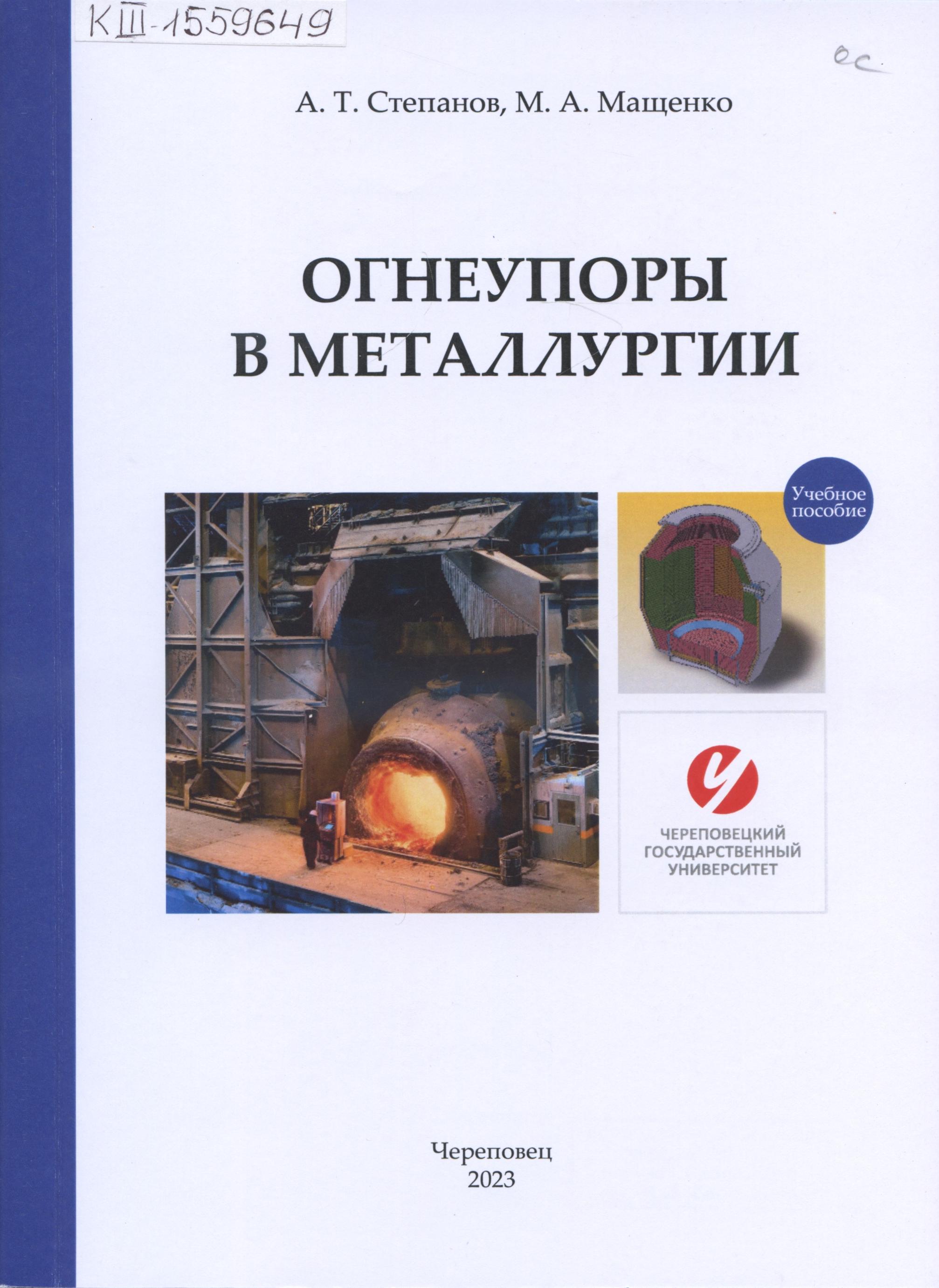 Степанов Александр Тимофеевич. Огнеупоры в металлургии : учебное пособие / А. Т. Степанов, М. А. Мащенко ; под общей редакцией А. Т. Степанова. – Череповец : ЧГУ, 2023. – 95 с.: ил., табл., портр. ; 24 см. – Библиогр.: с. 95 (7 назв.). – 300 экз. – ISBN 978-5-85341-951-3.