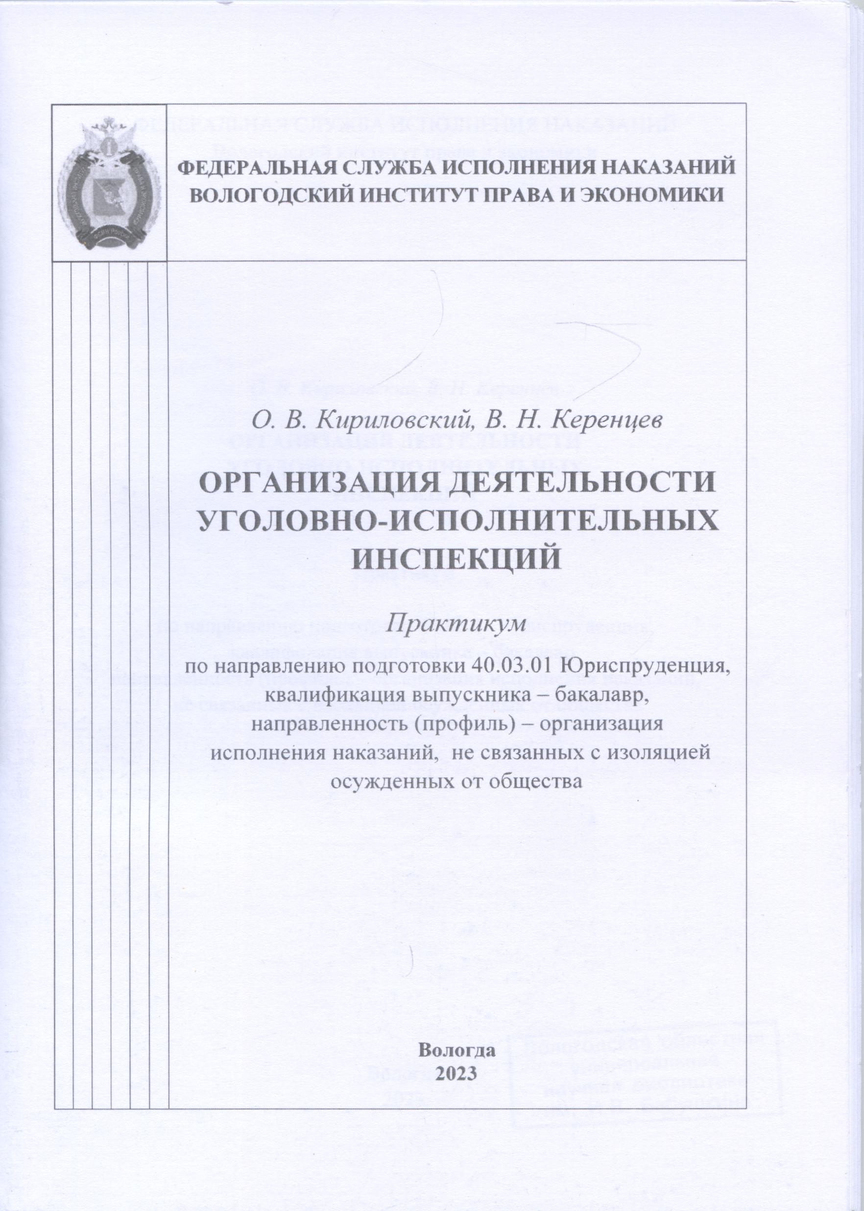 Кириловский Олег Валерьевич. Организация деятельности уголовно-исполнительных инспекций : практикум : по направлению подготовки 40.03.01 Юриспруденция, квалификация выпускника - бакалавр, направленность (профиль) – организация исполнения наказаний, не связанных с изоляцией осужденных от общества / О. В. Кириловский, В. Н. Керенцев ; Федеральная служба исполнения наказаний, Вологодский институт права и экономики. – Вологда : ВИПЭ ФСИН России, 2023. – 44 с. : табл. ; 20 см. – Библиогр. в конце тем – 22 экз. – ISBN 978-5-94991-726-8.