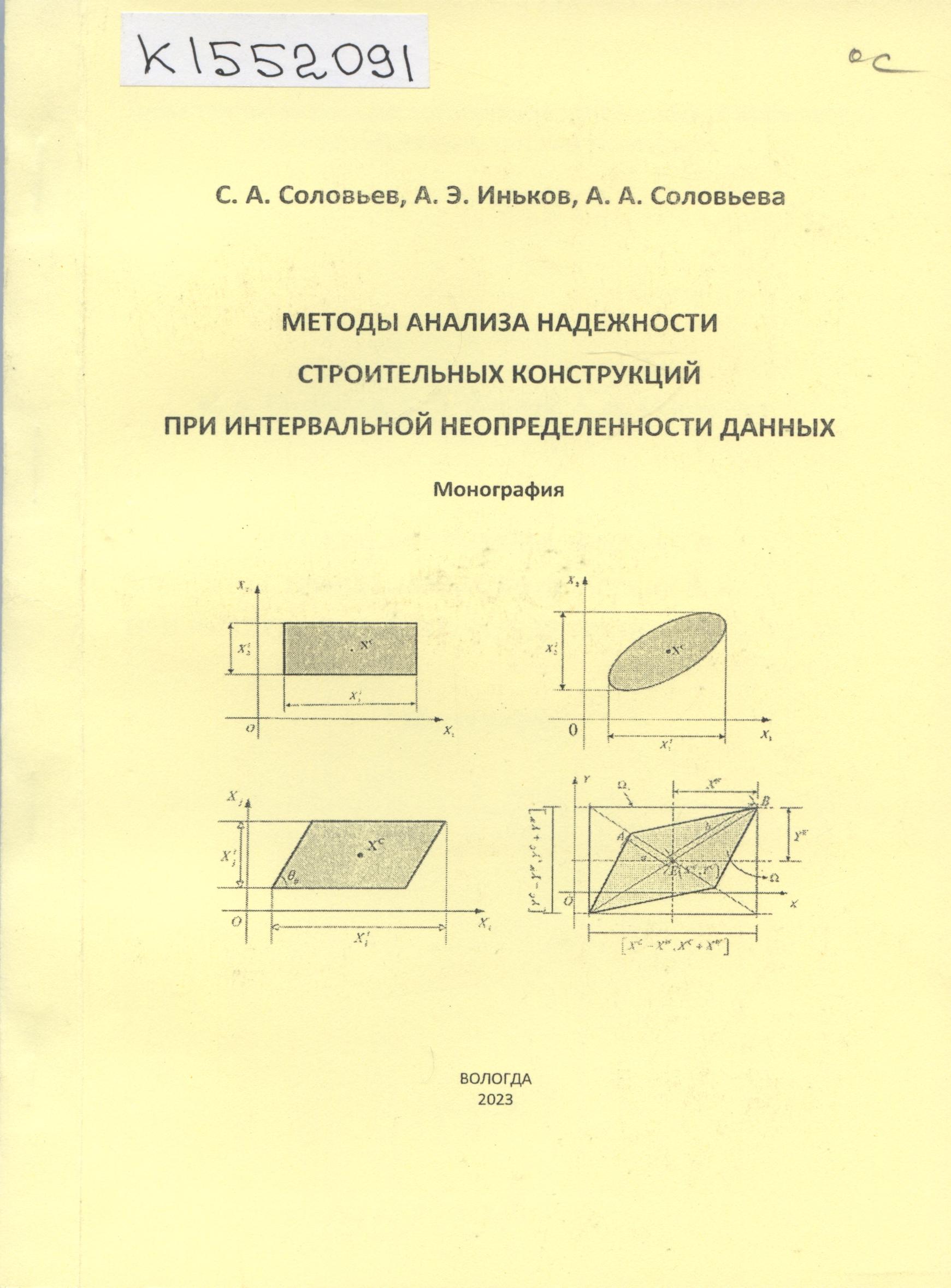 Соловьев Сергей Александрович. Методы анализа надежности строительных конструкций при интервальной неопределенности данных : монография / С. А. Соловьев, А. Э. Иньков, А. А. Соловьева ; Министерство науки и высшего образования Российской Федерации, Вологодский государственный университет. – Вологда : ВоГУ, 2023. – 143 с. : ил., граф., табл. ; 20 см. – Библиогр.: с. 139–142 (52 назв.). – 500 экз. – ISBN 978-5-907606-36-4.