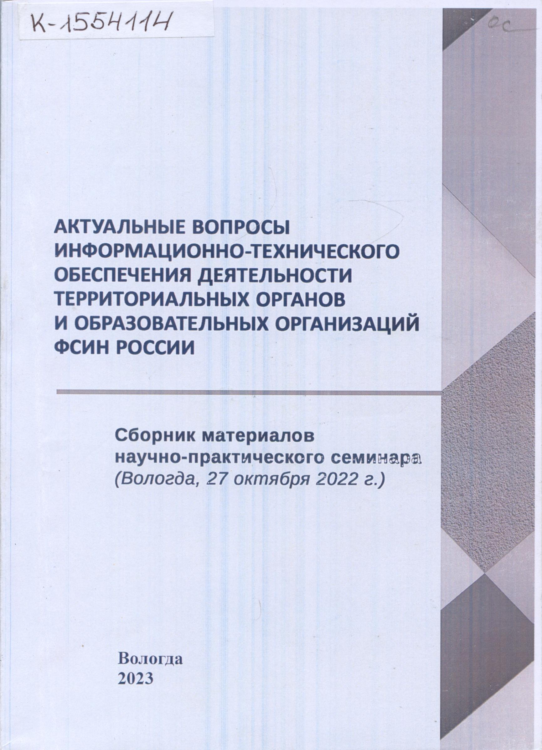 Актуальные вопросы информационно-технического обеспечения деятельности территориальных органов и образовательных организаций ФСИН России : сборник материалов научно-практического семинара (Вологда, 27 октября 2022 г.) / Федеральная служба исполнения наказаний, Вологодский институт права и экономики ; под редакцией кандидата педагогических наук, доцента А. А. Бабкина. – Вологда : ВИПЭ ФСИН России, 2023. – 167 с.: ил. ; 21 см. – 22 экз. – ISBN 978-5-94991-686-5.