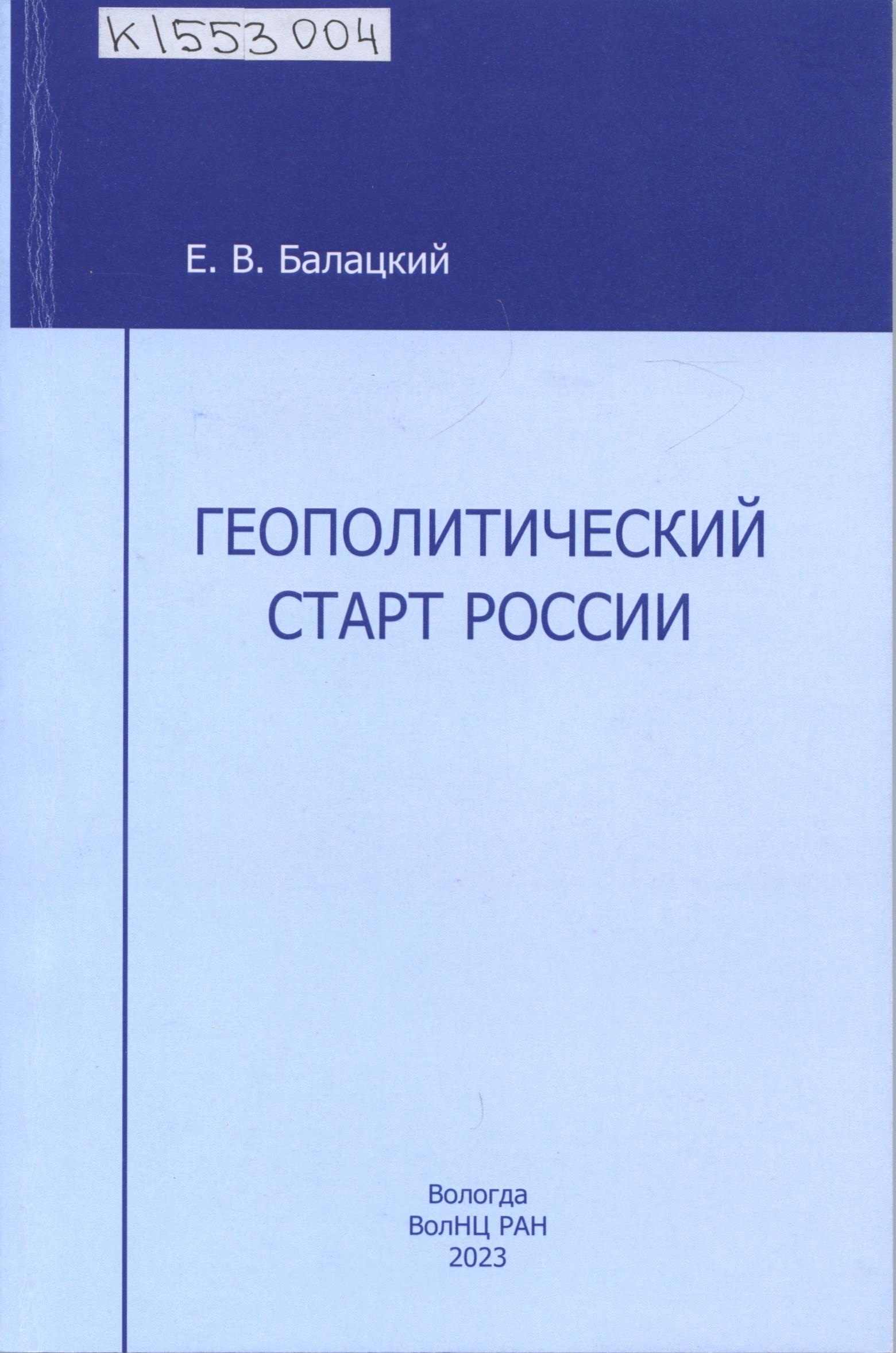 Балацкий Евгений Всеволодович. (доктор экономических наук ; 1966-) Геополитический старт России / Е. В. Балацкий ; Вологодский научный центр Российской академии наук. – Вологда : ВолНЦ РАН, 2023. – 129 с.: ил., табл., схем. ; 20 см. – Ч. текста англ. – Библиогр.: с. 123–128 и в подстроч. примеч. – 500 экз. – ISBN 978-5-93299-566-2.