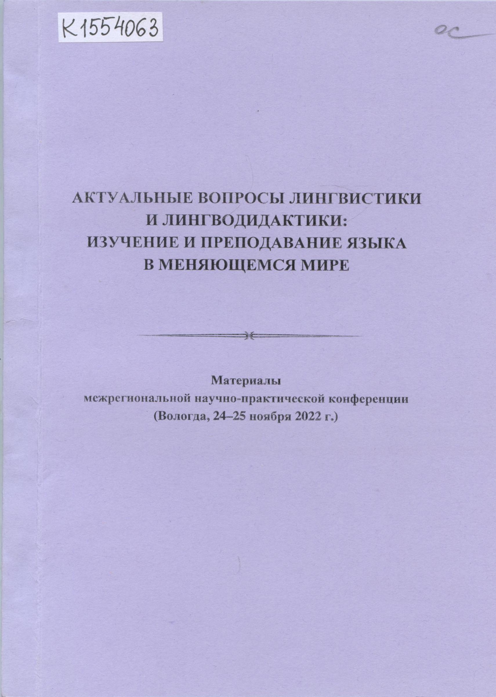 Актуальные вопросы лингвистики и лингводидактики: изучение и преподавание языка в меняющемся мире : материалы межрегиональной научно-практической конференции (Вологда, 24-25 ноября 2022 г.) / Министерство науки и высшего образования Российской федерации, Вологодский государственный университет ; ответственные редакторы: С. А. Кароннова, Ж. И. Подоляк. – Вологда : ВоГУ, 2023. – 90 с.: ил., табл. ; 20 см. – Рез. на англ. яз. – Часть текста на англ. и нем. яз. – Библиогр. в конце ст. – 300 экз. – ISBN 978-5-907606-58-6.