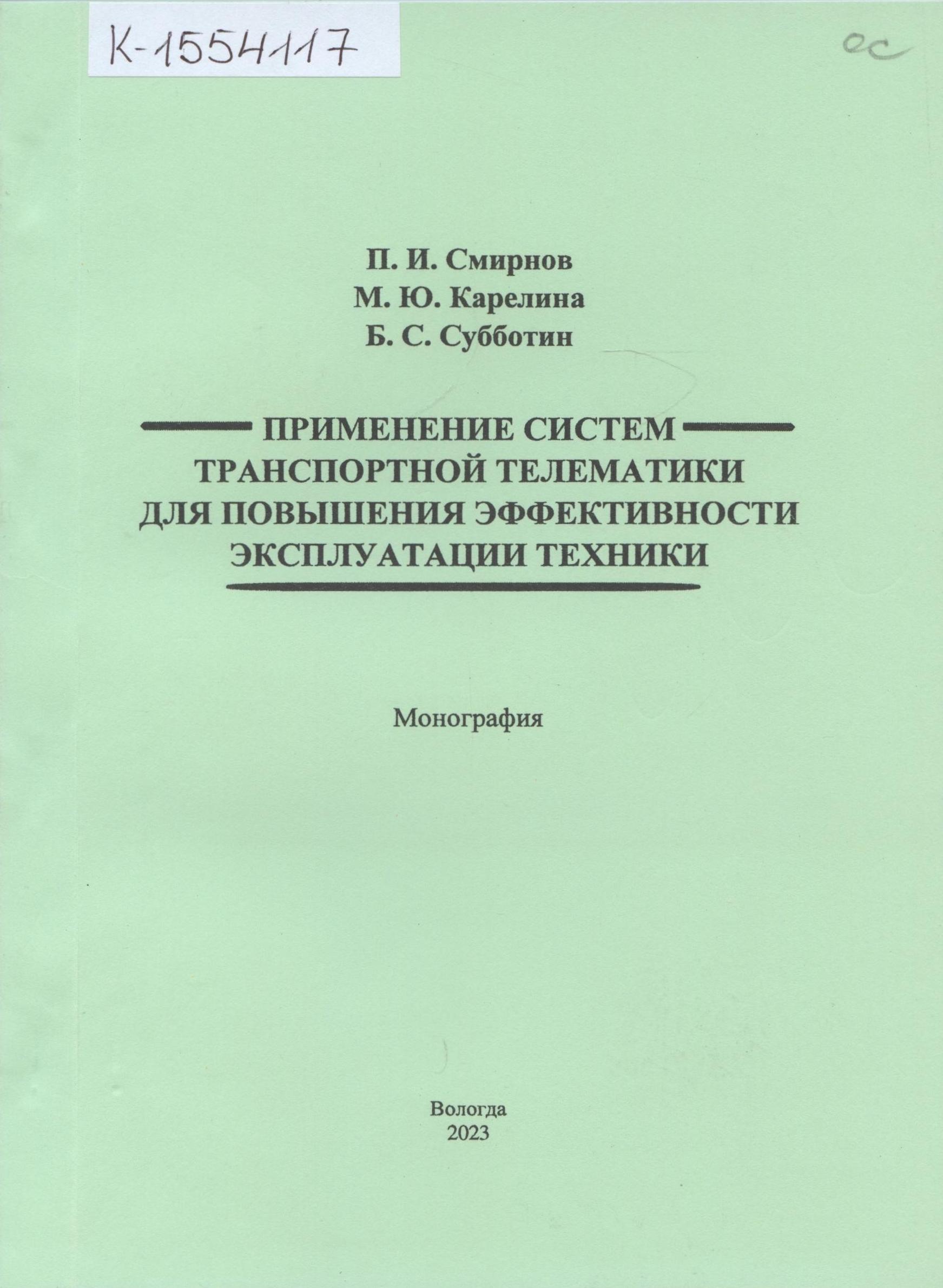 Смирнов Петр Ильич. Применение систем транспортной телематики для повышения эффективности эксплуатации техники : монография / П. И. Смирнов, М. Ю. Карелина, Б. С. Субботин ; Министерство науки и высшего образования Российской Федерации, Вологодский государственный университет. – Вологда : ВоГУ, 2023. – 124 с.: ил. ; 21 см. – Библиогр.: с. 123–124 (11 назв.). – 500 экз. – ISBN 978-5-907606-51-7.