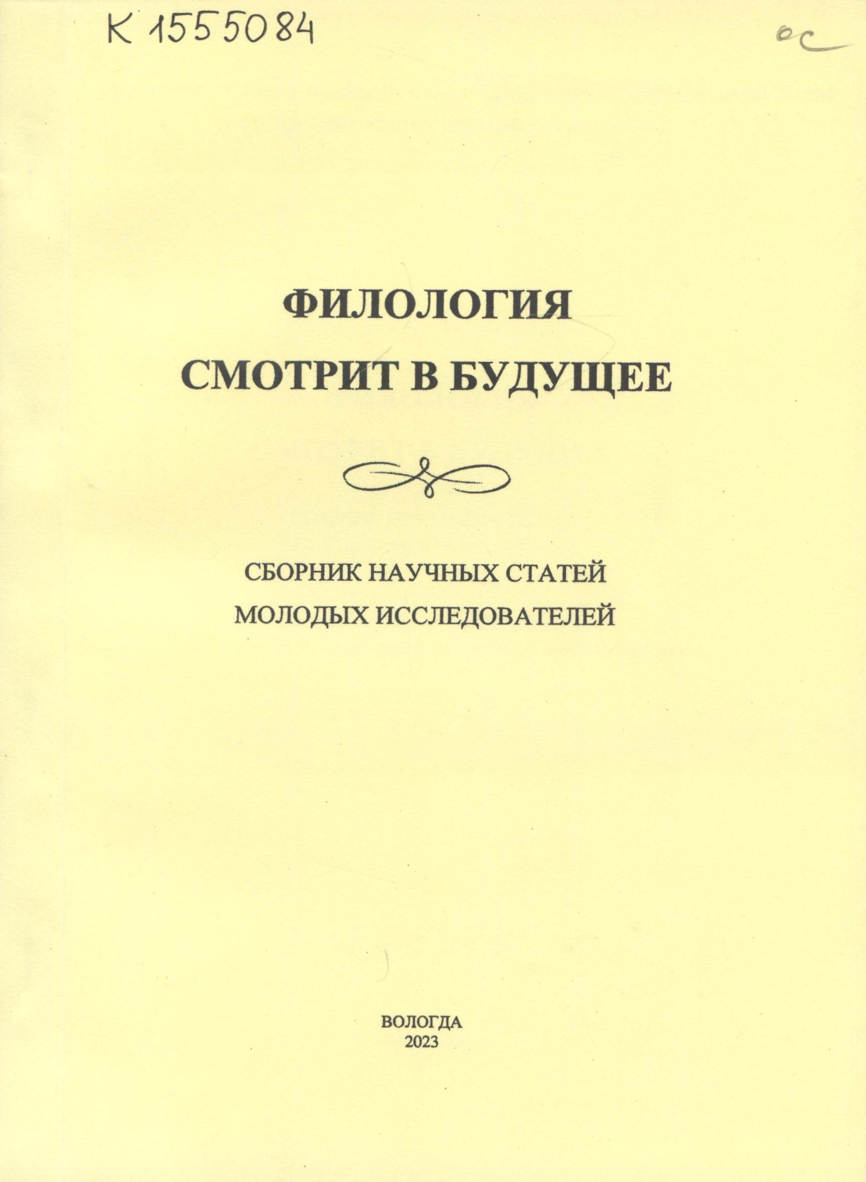 Филология смотрит в будущее : сборник научных статей молодых исследователей / Министерство науки и высшего образования Российской Федерации, Вологодский государственный университет ; составитель и научный редактор Е. Н. Ильина, доктор филологических наук, профессор. – Вологда : ВоГУ, 2023. – 155 с.: ил., табл. ; 20 см. – Библиогр. в конце ст. – 300 экз. – ISBN 978-5-907606-60-9.