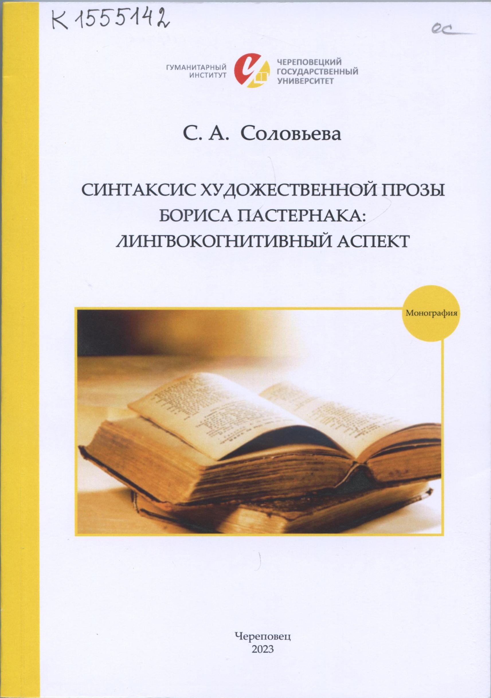 Соловьева Светлана Александровна. Синтаксис художественной прозы Б. Пастернака : лингвокогнитивный аспект : монография / С. А. Соловьева. – Череповец : Череповецкий государственный университет, 2023. – 232 с.: табл. ; 21 см. – Библиогр.: с.206-226. – 500 экз. – ISBN 978-5-85341-940-7.