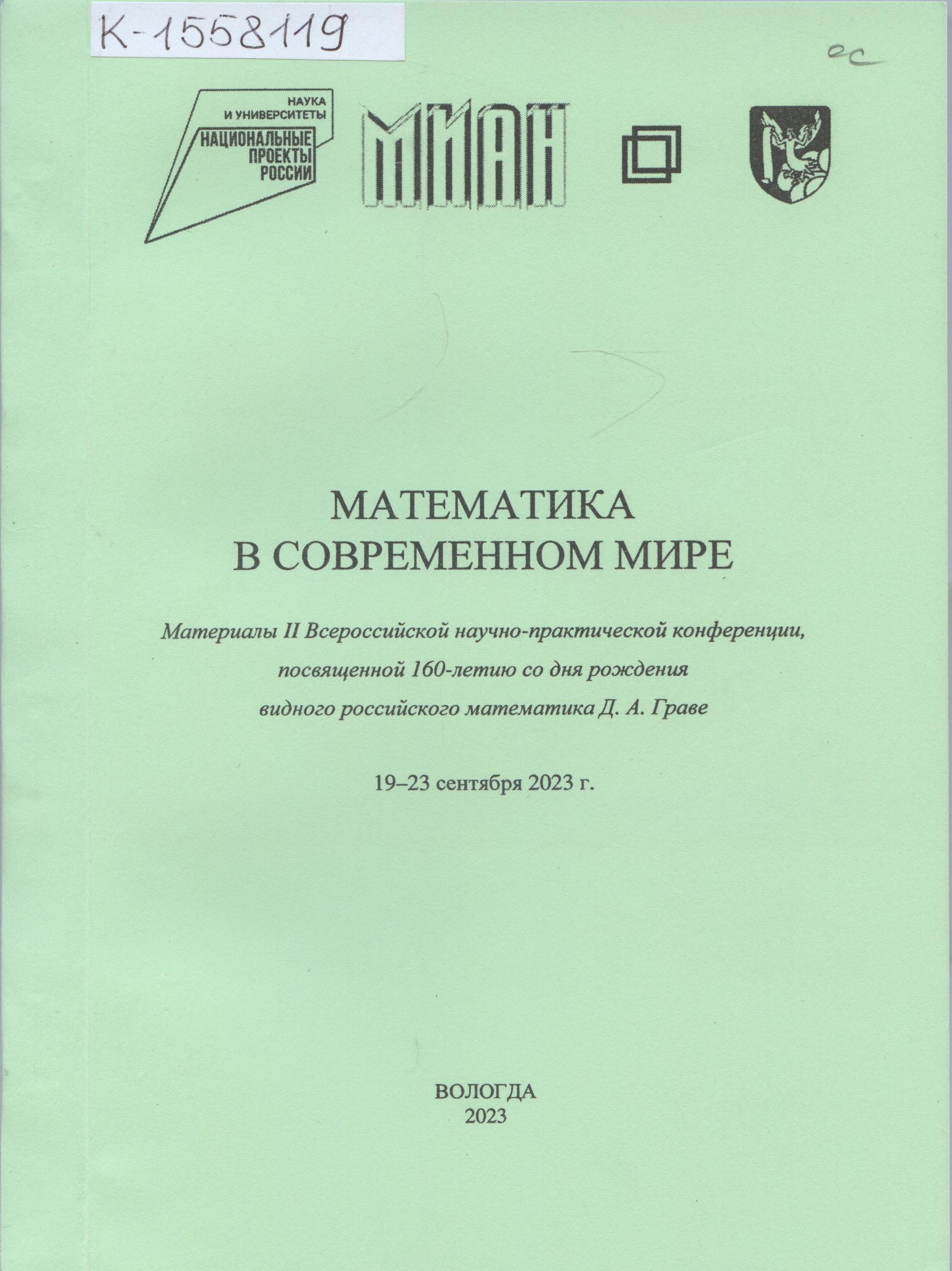 Математика в современном мире : материалы II Всероссийской научно-практической конференции, посвященной 160-летию со дня рождения видного российского математика Д. А. Граве (19-23 сентября 2023 г.) / Министерство науки и высшего образования Российской Федерации и др. ; ответственные редакторы: В. А. Тестов, Н. В. Маслова. – Вологда : ВоГУ, 2023. – 206 с.: ил. ; 21 см. – Библиография в конце докладов – 300 экз. – ISBN 978-5-907606-72-2.