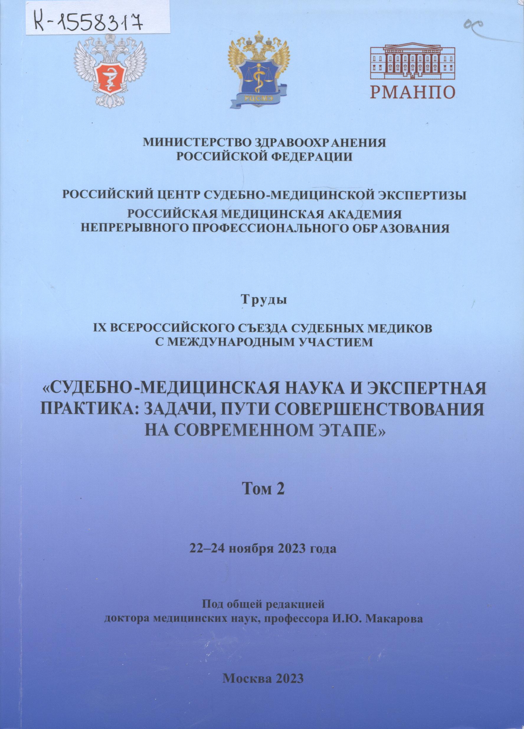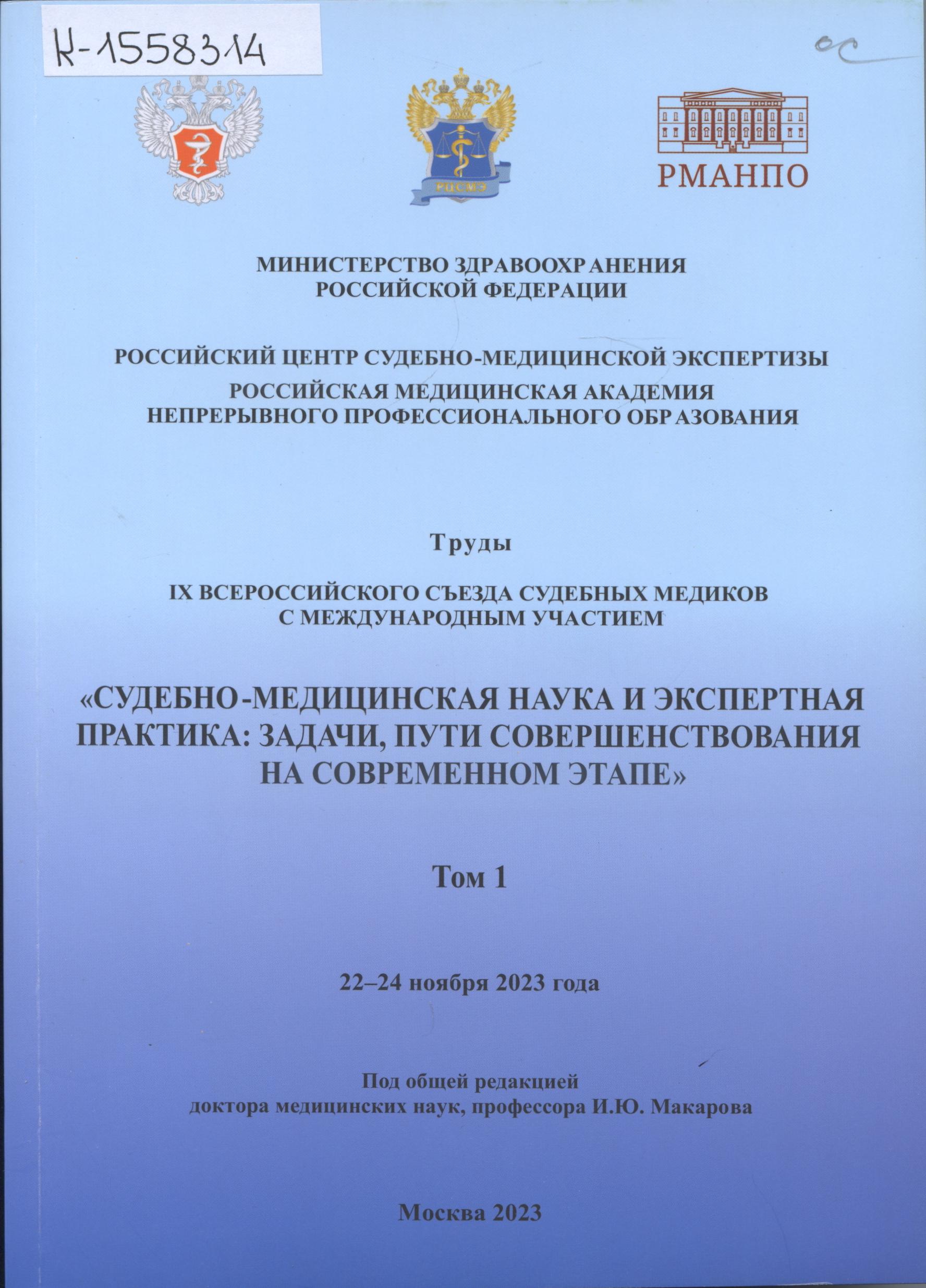 Труды IX Всероссийского съезда судебных медиков с международным участием "Судебно-медицинская наука и экспертная практика: задачи, пути совершенствования на современном этапе", 22-24 ноября 2023 года : в 2 томах. Том 1 / Российский центр судебно-медицинской экспертизы, Российская медицинская академия непрерывного профессионального образования ; под общей редакцией И. Ю. Макарова. – Москва : РЦСМЭ ; Череповец : Мочалов С. В., 2023. – 540 с.: ил., цв. ил., табл. ; 21 см. – Библиогр. в конце ст. – 500 экз. – ISBN 978-5-91965-347-9.
