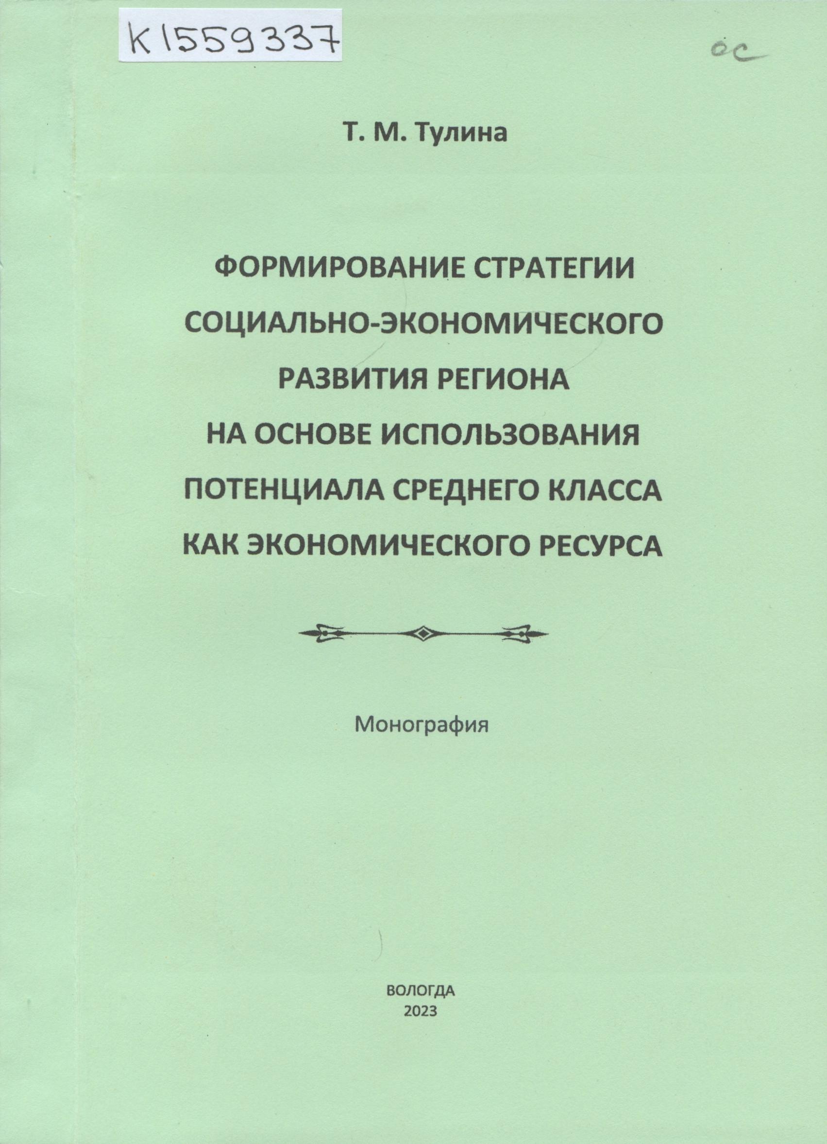 Тулина Таисия Михайловна. Формирование стратегии социально-экономического развития региона на основе использования потенциала среднего класса как экономического ресурса : монография / Т. М. Тулина ; Министерство науки и высшего образования Российской Федерации, Вологодский государственный университет. – Вологда : ВоГУ, 2023. – 203 с.: ил., табл. ; 21 см. – Библиогр.: с. 167-182 (184 назв.) и в подстроч. примеч. – 500 экз. – ISBN 978-5-907606-77-7.