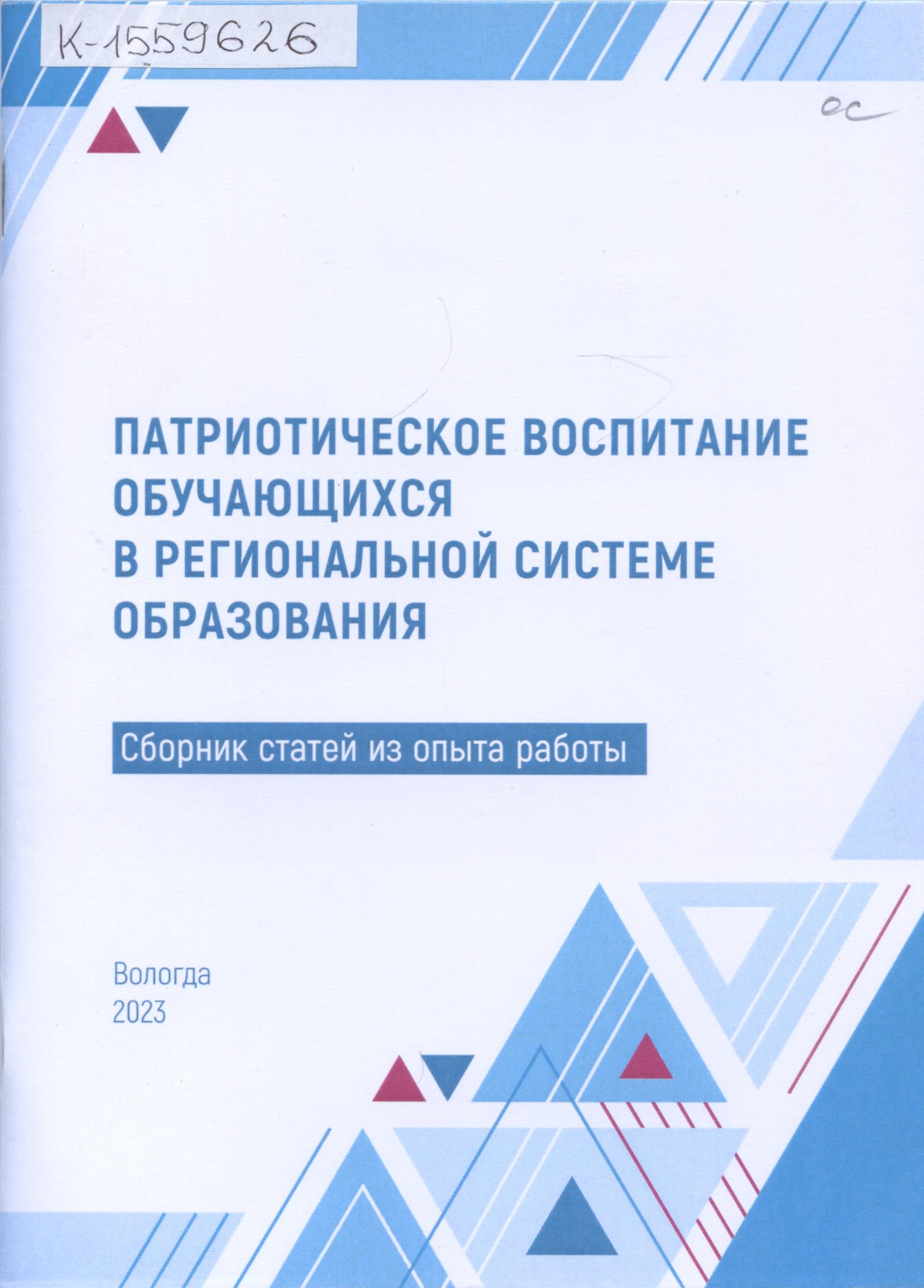 Патриотическое воспитание обучающихся в региональной системе образования : сборник статей из опыта работы / Департамент образования Вологодской области, Вологодский институт развития образования ; редколлегия: М. А. Углицкая (ответственный редактор), Е. Ю. Ногтева, С. В. Потерюхина и др. – Вологда : ВИРО, 2023. – 83, [1] с.: табл. ; 20 см. – 100 экз. – ISBN 978-5-87590-549-0.