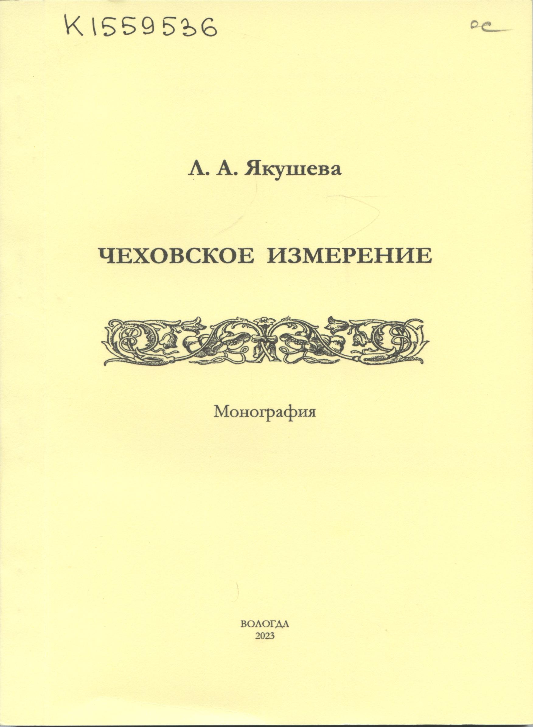 Якушева Людмила Алентиновна. Чеховское измерение : монография / Л. А. Якушева ; Министерство науки высшего образования Российской федерации, Вологодский государственный университет. – Вологда : ВоГУ, 2023. – 115 с. ; 20 см. – Библиогр.: с. 99–115 (287 назв.) – 500 экз. – ISBN 978-5-907606-65-4.
