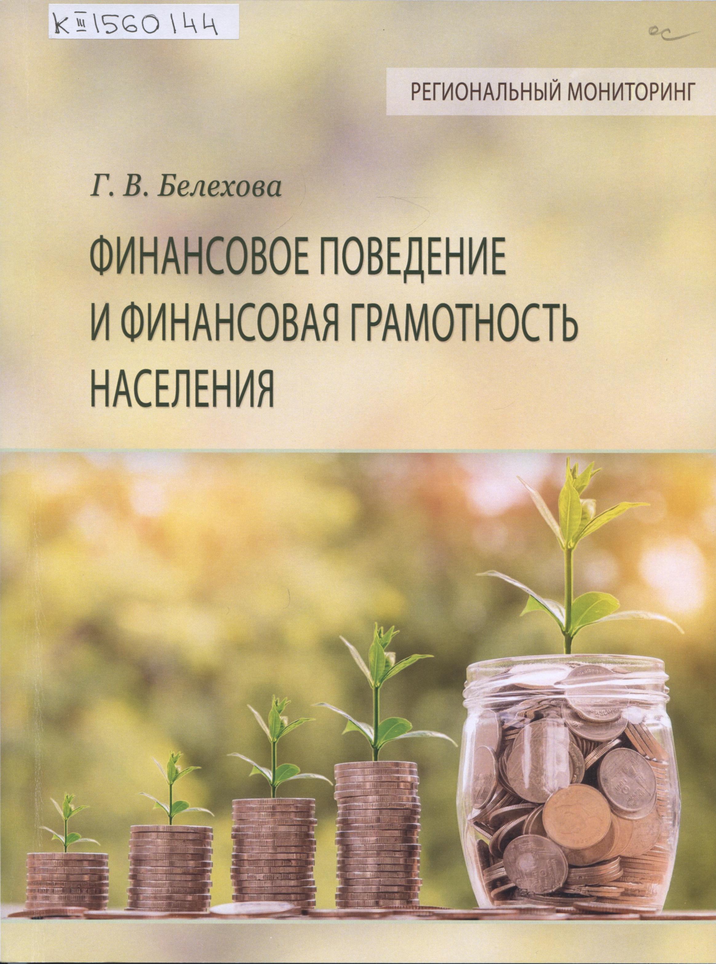 Белехова Галина Вадимовна. Финансовое поведение и финансовая грамотность населения : монография / Г. В. Белехова ; под научным руководством А. А. Шабуновой ; Вологодский научный центр РАН. – Вологда : ВолНЦ РАН, 2023. – 249 с.: табл., граф. ; 26 см. – (Региональный мониторинг). – Библиогр.: с. 121–130 (149 назв.) и в подстроч. примеч. – 500 экз. – ISBN 978-5-93299-587-7.