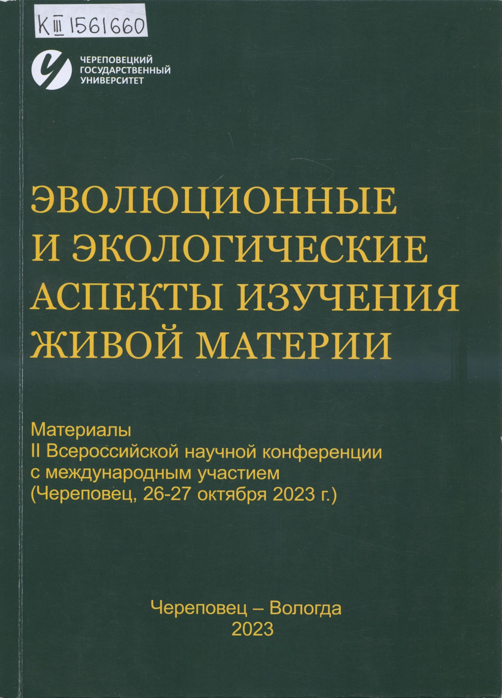 Эволюционные и экологические аспекты изучения живой материи : материалы II Всероссийской научной конференции с международным участием (Череповец, 26–27 октября 2023 г.) / Череповецкий государственный университет ; ответственный редактор В. В. Петрова. – Череповец ; Вологда : Сад-огород, 2023. – 168 с.: ил., портр. ; 24 см. – К 70-летию со дня рождения российского зоолога, орнитолога Николая Петровича Коломийцева. – Рез. на англ. яз. – Библиогр. в конце ст. – 100 экз. – ISBN 978-5-85341-948-3.
