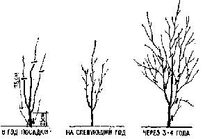 На рисунках: сверху - плодоношение на однолетних приростах (первая группа сортов); в центре - плодоношение на букетных веточках и шпорцах (вторая группа сортов); внизу - плодоношение на однолетних приростах, букетных веточках и шпорцах (третья группа сортов). |
