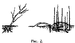 Горизонтальные отводки (рис. 2). Для получения горизонтальных отводков молодому дереву, побегу или ветке придают горизонтальное положение и укладывают их на дно бороздки глубиной 5 см, предварительно немного укоротив. Для закрепления уложенных ветвей используют деревянные или металлические рогатины. Как только на уложенных частях растения начнут отрастать побеги, их окучивают так же, как и вертикальные отводки. При отделении отводков горизонтально уложенные побеги режут на части, оставляя по одному окорененному приросту. Несколько побегов оставляют для раскладки в следующем году.