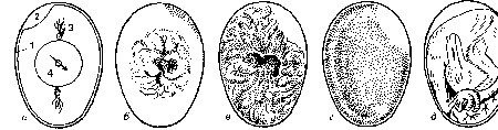 а - свежее яйцо; б - яйцо после 5-6 дней насиживания; б - яйцо после 9-10 дней насиживания; г - яйцо после 11-15 дней насиживания; д - яйцо после 16-18 дней насиживания; 1 - скорлупа; 2 - воздушная камера; 3 - белок; 4 - желток.