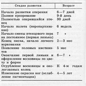 В месячном возрасте молодые голуби, уже полностью оперившиеся, начинают пробные полеты в питомнике с полки на полку, а затем первые выходы в вольер. В этот период рекомендуется, если имеется возможность, перевести голубят в другое отделение, где они переходят на самостоятельную жизнь. После того, как голубята освоятся в новом помещении, им дают возможность выходить на улицу, чтобы совершать свои первые полеты. Когда молодые птицы "встанут на крыло", то есть будут уверенно летать, их можно выпускать в полеты со старыми голубями. Возраст голубей играет немаловажную роль при их разведении. Обычно голуби живут до 15 лет, в редких случаях до 20 лет и более. Год выведения голубя можно узнать по кольцу на ноге. Если оно отсутствует, то правильность определения возраста в полной мере зависит от знаний голубевода, его наблюдательности и опыта (табл. 2).