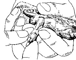 Кольцевание. Процесс этот очень прост. На 5-9-й день жизни берут птенца, складывают передние три пальца на любой его ноге и всовывают их в кольцо, затем задний палец прижимают к плюсне и протягивают кольцо выше, пока оно не пройдет конец заднего пальца (рис. 14). Задний палец опускается и кольцо остается на плюсне выше пальцев. С возрастом лучезапястный сустав разрастается и неразъемное кольцо остается на ноге голубя на всю жизнь. Это его паспорт. На кольце обычно обозначен год выведения, учетный номер, индекс, который условно может обозначать город, и буквы, обозначающие страну, где голубь был выведен. В декоративном и гонном голубеводстве селекционно-племенная работа без учета не возможна, а в спортивном голубеводстве без родового кольца голубь не может быть принят для участия в соревнованиях. Родовые кольца для голубей бывают различных диаметров, в зависимости от того, для каких пород голубей они сделаны. Для голубей мелких пород с неоперенными ногами применяют кольца диаметром 7 мм, для спортивных голубей - 7,8, для декоративных мелких голубей с оперенными ногами и для крупных голубей с неоперенными ногами - 8,5-9, для голубей с сильно оперенными ногами - 11-12 мм.