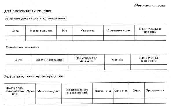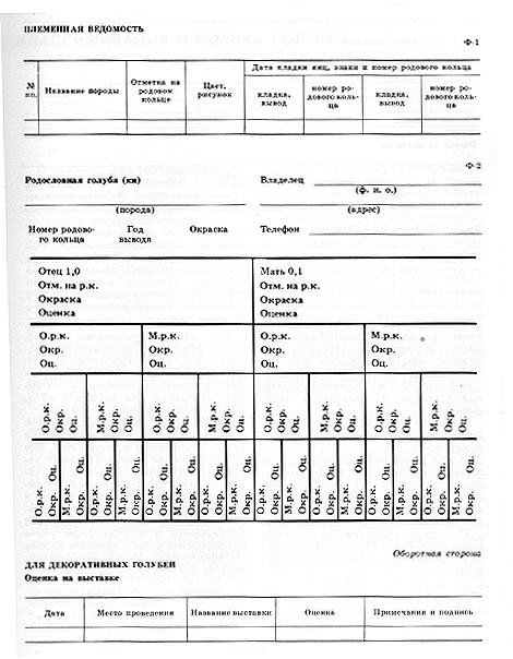 Каждый голубевод должен знать, что для достижения высоких результатов в разведении чистопородных птиц необходимо вести племенную ведомость. Успехов в работе достигает лишь тот селекционер, который узнает своих голубей не только по внешнему виду, но и по их показателям, ведет тщательный учет и контроль. Наиболее подробный учет селекционной работы осуществляется при ведении "Регистрационного журнала голубевода-селекционера ", который выпущен секцией голубеводов ГДР. Он имеет пять форм для записи учета при ведении планового хозяйства.