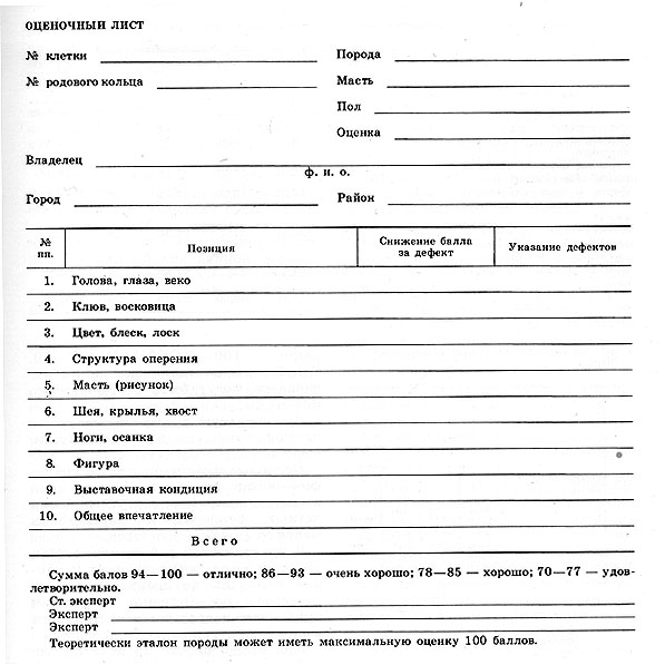 Подобные формы оценки со специфическими пунктами и расценкой имеются, например, для английских летных типлеров и харьковских мастных (цветных) голубей.