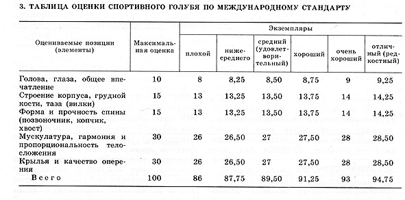 Спортивных голубей оценивают по международной форме, имеющей пять пунктов, значимость которых различна (табл. 3). Для спортивных (почтовых) голубей основными показателями являются элементы, определяющие высокие летные качества. Их и оценивают значительно выше, чем прочие.