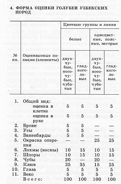 Своеобразную форму оценки своих национальных пород разработали узбекские голубеводы (табл. 4).